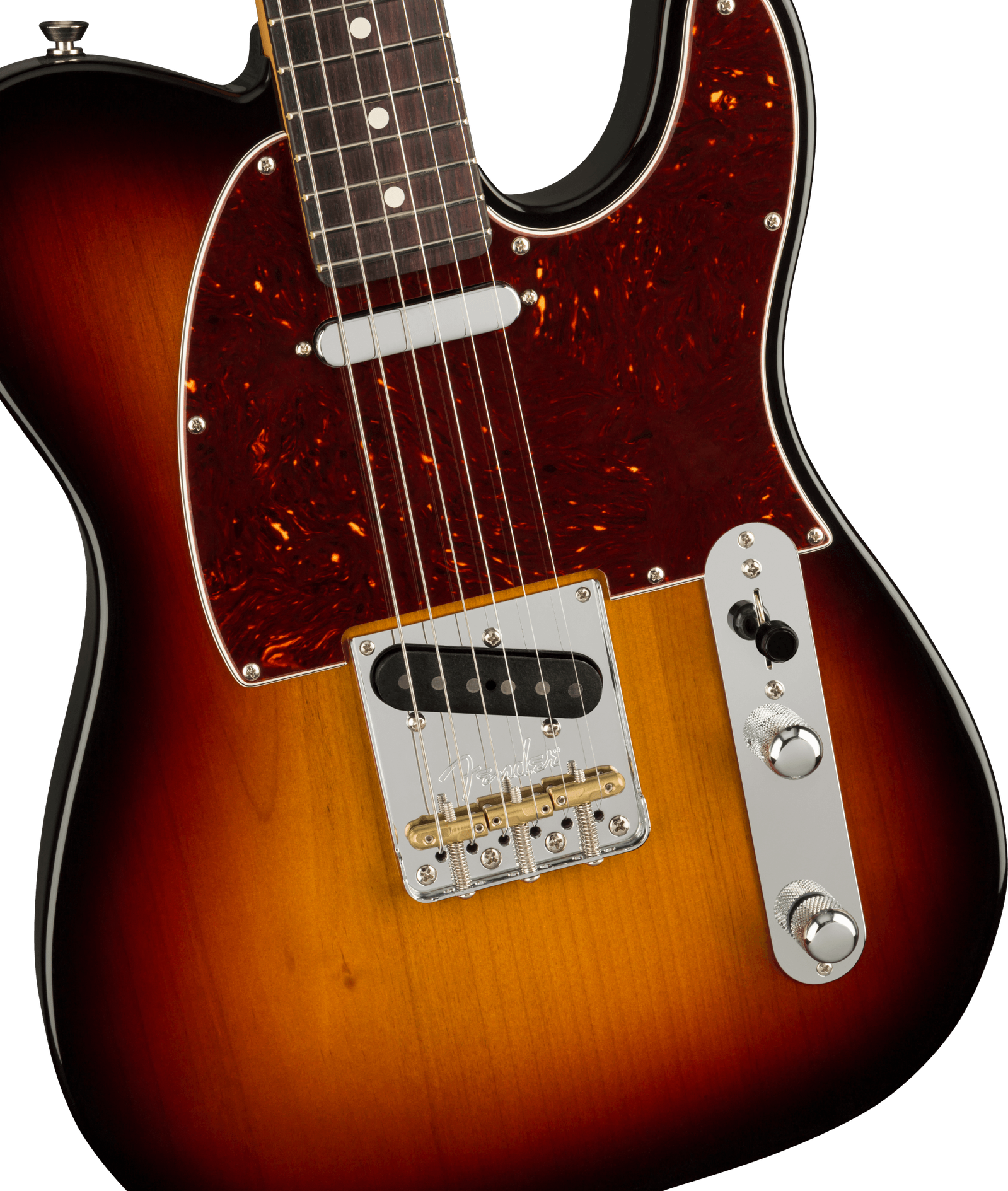 The Fender American Professional II Telecaster RW in 3-Colour Sunburst refines a classic with modern upgrades designed for working musicians. It features a Deep āCā neck with rolled edges, a Super-Natural satin finish, and a sculpted neck heel for comfort and upper fret access. V-Mod II Telecaster single-coil pickups capture the iconic twang and bite with enhanced articulation, while a push-push tone control activates series mode for thicker tones. The new top-load/string-through bridge with compensated brass bullet saddles offers flexible stringing options, superb intonation, and vintage-informed tone. Finished in gloss urethane over alder, this Tele balances tradition with precision engineering. Complete with a deluxe moulded hardshell case, itās built for stage, studio, and everything between. At Riffs & Licks Music, we think this Tele delivers the perfect blend of heritage tone and modern versatility.