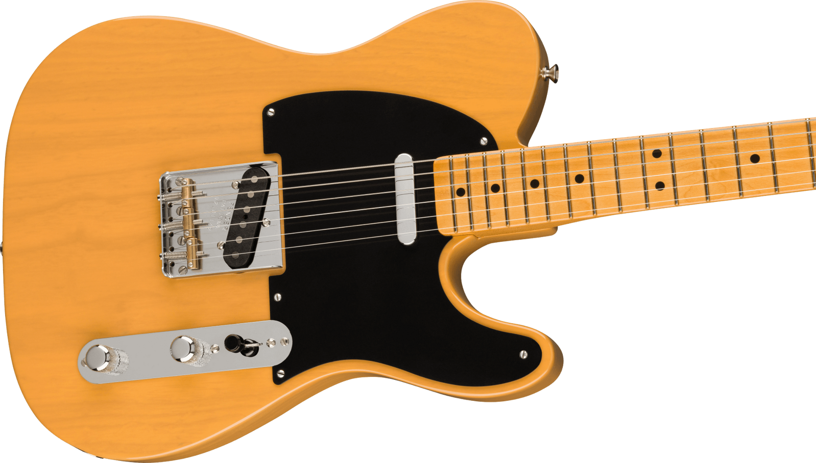 This faithful tribute features a pair of Pure Vintage '51 Single-Coil Tele pickups, a period-accurate Ash body, a nice and thick period-accurate 1951 "U"-profile 1-Piece Maple neck, and Maple fingerboard with 21 Vintage Tall frets - all of which expertly captures the tone, look, and feel of the original king of twang. Other period-accurate features abound, like a Pure Vintage 3-saddle Tele bridge with brass barrel saddles, Pure Vintage single-line Fender Deluxe machine heads, and a 1-ply black phenolic pickguard. Fender have even included the narrower 12th-fret dot spacing, and just like the original, the only Phillips head screw on this Tele is at the truss rod nut. An understated yet eye-catching Butterscotch Blonde Gloss Nitrocellulose Lacquer finish completes the vintage aesthetic, while a vintage-style tweed hard case with crushed red interior keeps your instrument protected in style.
