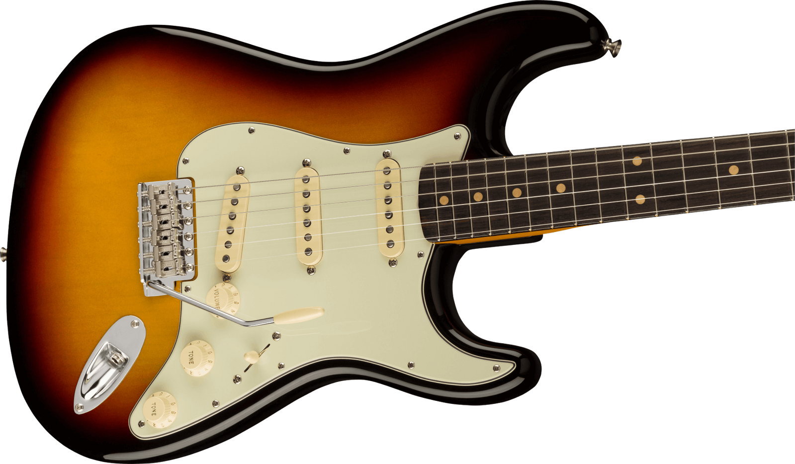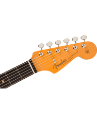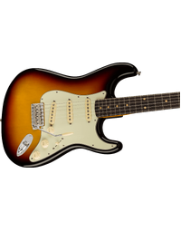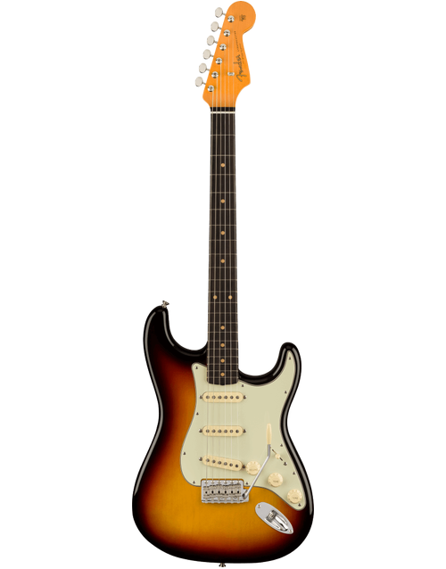 The early '60s saw the refinement of the Strat's image - with new finishes introduced, and old finishes refreshed, and a 3-ply pickguard to complement its curvy body. Though Fender's product range (and popularity) had expended dramatically, and included a huge range of innovative new instruments, the Strat continued to reign supreme. This faithful tribute features three Pure Vintage '61 Single-Coil Strat pickups, a period-accurate premium Alder body, an eminently comfortable period-accurate 1961 "C"-profile Maple neck, and Slab Rosewood fingerboard with 21 Vintage Tall frets. Other period-accurate features abound, like a Pure Vintage synchronised tremolo, Pure Vintage single-line Fender Deluxe machine heads, and a 3-ply mint green pickguard. An understated yet eye-catching 3-Colour Sunburst Gloss Nitrocellulose Lacquer finish completes the vintage aesthetic, while a vintage-style brown hard case with orange interior keeps your instrument protected in style.