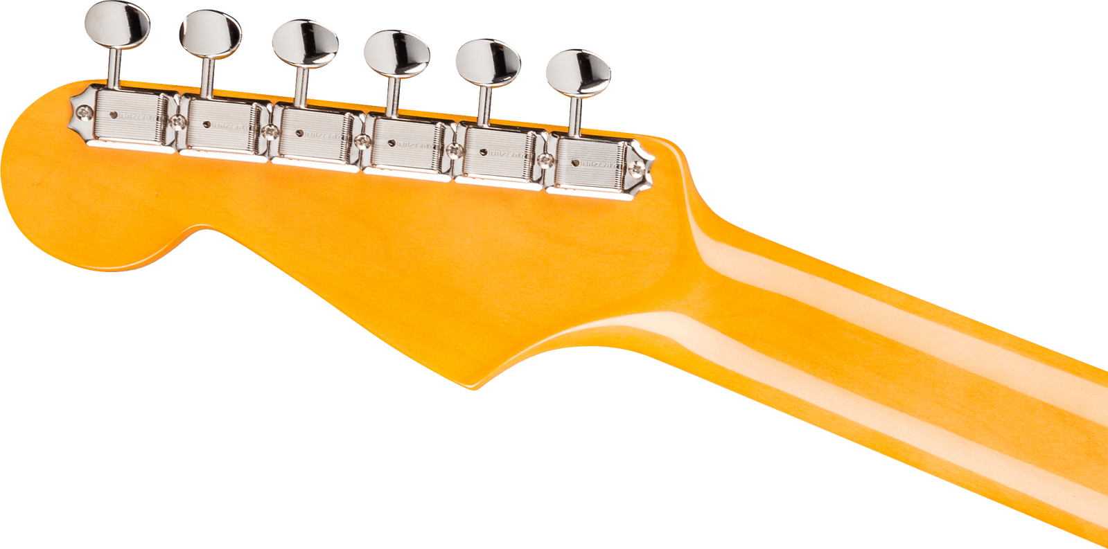 The Fender American Vintage II 1965 Stratocaster in Sonic Blue recreates an iconic era of Stratocaster history with vintage-accurate detail. Crafted with an alder body finished in gloss nitrocellulose lacquer, this guitar delivers the resonant, open tone that defined the golden age of rock and blues. The 1965 "C"-shaped maple neck with a round-laminated rosewood fingerboard and larger pearl dot inlays provides smooth playability with period-authentic feel.