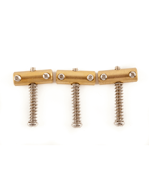 Set of three compensated brass bridge saddles for use on vintage-style three-saddle Telecaster bridges (does not fit standard six-saddle Telecaster bridges). Set includes saddles, intonation springs, slotted intonation screws and saddle-height adjustment screws.
