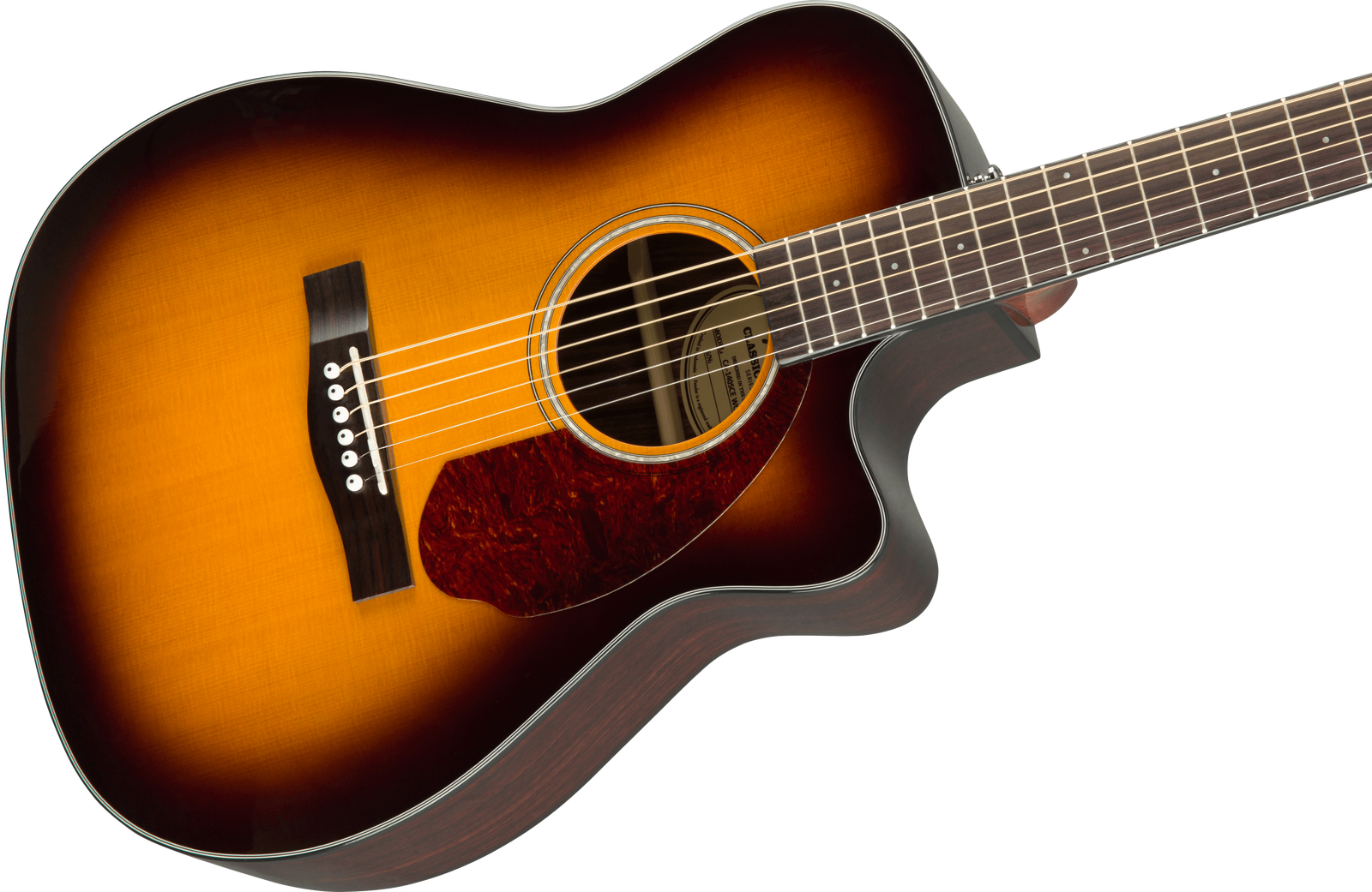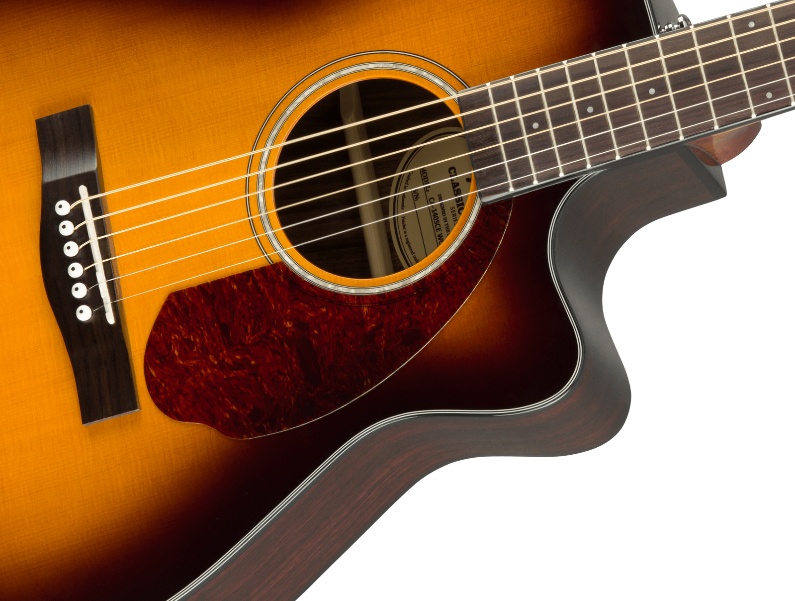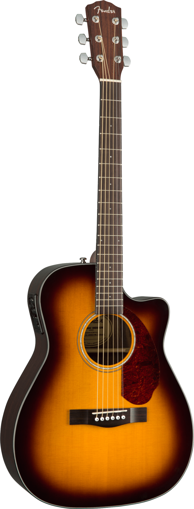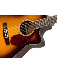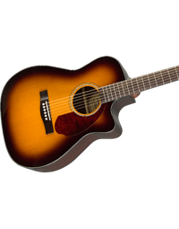 The Fender CC-140SCE, finished in Sunburst, expands its sibling's features with upgraded Fishman Presys electronics, Ovangkol back and sides, solid Spruce top, and the addition of a hardshell case. The single-cutaway concert-sized body and solid Spruce top provide an articulate voice, and the easy-to-play neck provides hours of comfortable playability. Topped off with a tortoiseshell pickguard and ovangkol headcap, the Fender CC-140SCE is ready for whatever you throw at it, whether at home, on stage, or in the studio.