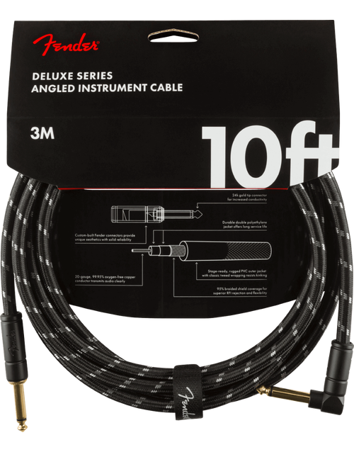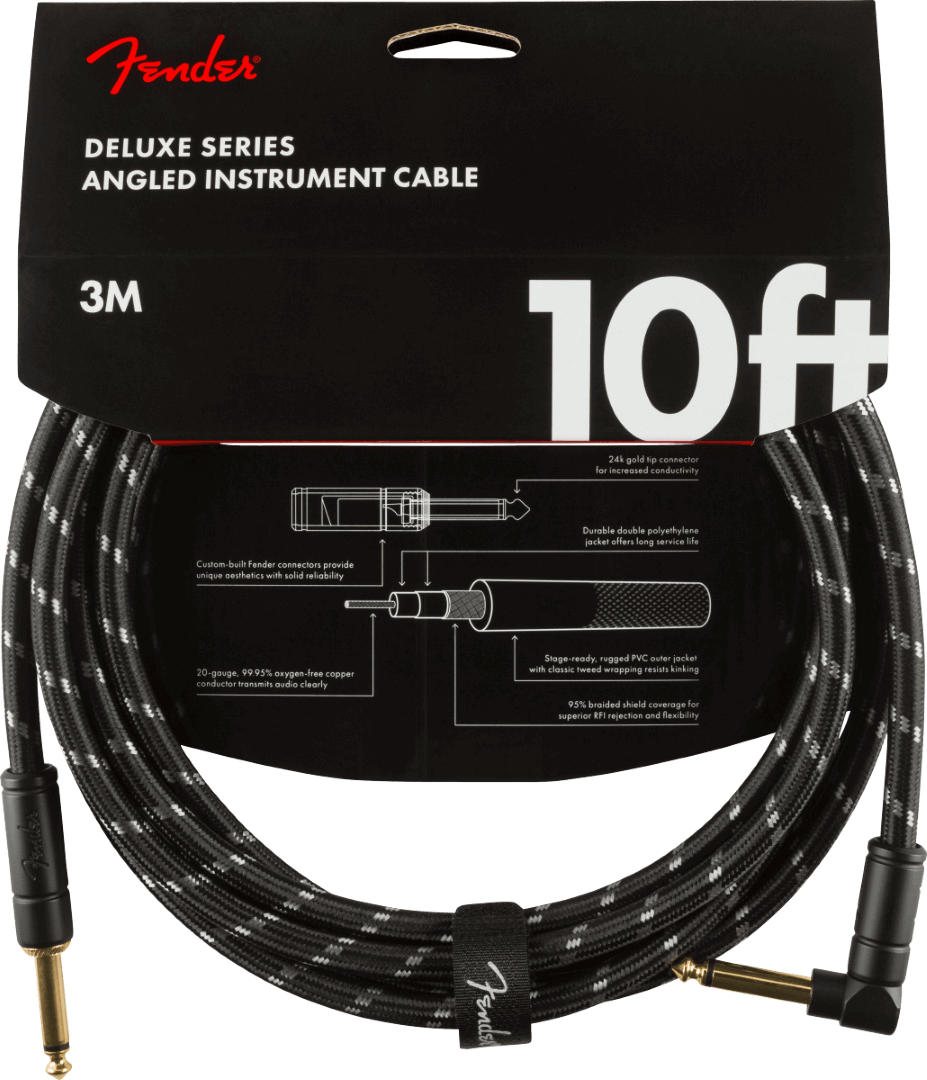 Fender Deluxe Series cables carry the highest quality materials and braided shielding to deliver flagship durability, conductance and transparency. These top-of-the-line cables sport custom moulded ends with strain relief under the housing - plus 24K gold-plated connectors that won't tarnish or degrade your sound over time. These cables use a very quiet braided shielding that is engineered to maximize the purity of your tone, and they're protected by a soft-woven yet rugged tweed jacket that provides ultimate protection with classic Fender style.