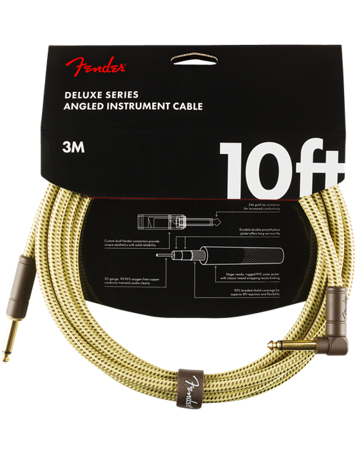Fender Deluxe Series cables carry the highest quality materials and braided shielding to deliver flagship durability, conductance and transparency. Our top-of-the-line cables sport custom molded ends with strain relief under the housing - plus 24K gold-plated connectors that won't tarnish or degrade your sound over time. These cables use a very quiet braided shielding that is engineered to maximize the purity of your tone, and they're protected by a soft-woven yet rugged tweed jacket that provides ultimate protection with classic Fender style.