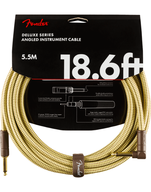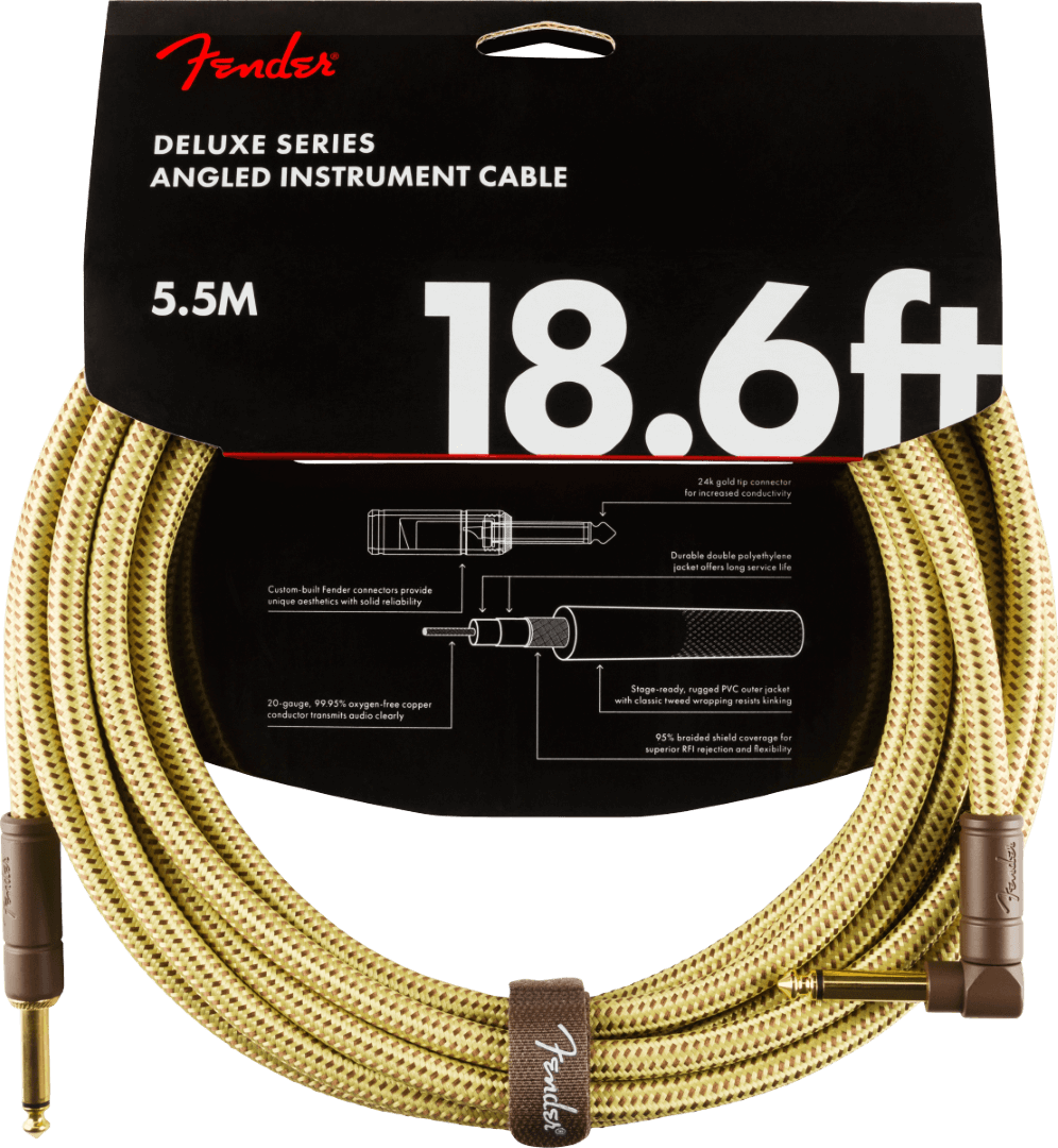 Fender Deluxe Series cables carry the highest quality materials and braided shielding to deliver flagship durability, conductance and transparency. Our top-of-the-line cables sport custom molded ends with strain relief under the housing - plus 24K gold-plated connectors that won't tarnish or degrade your sound over time. These cables use a very quiet braided shielding that is engineered to maximize the purity of your tone, and they're protected by a soft-woven yet rugged tweed jacket that provides ultimate protection with classic Fender style.