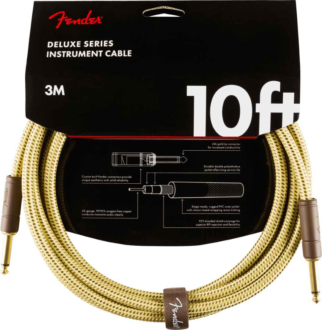 Fender Deluxe Series cables carry the highest quality materials and braided shielding to deliver flagship durability, conductance and transparency. Fender's top-of-the-line cables sport custom moulded ends with strain relief under the housing - plus 24K gold-plated connectors that won't tarnish or degrade your sound over time. These cables use a very quiet braided shielding that is engineered to maximize the purity of your tone, and they're protected by a soft-woven yet rugged tweed jacket that provides ultimate protection with classic Fender style.