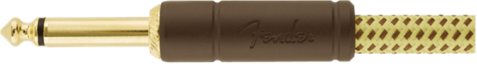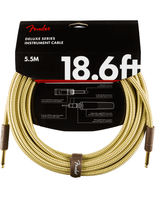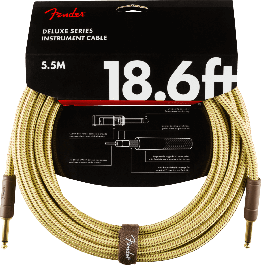 Fender Deluxe Series cables carry the highest quality materials and braided shielding to deliver flagship durability, conductance and transparency. Our top-of-the-line cables sport custom molded ends with strain relief under the housing - plus 24K gold-plated connectors that won't tarnish or degrade your sound over time. These cables use a very quiet braided shielding that is engineered to maximize the purity of your tone, and they're protected by a soft-woven yet rugged tweed jacket that provides ultimate protection with classic Fender style.