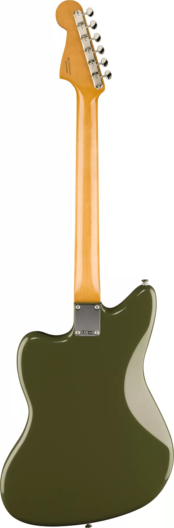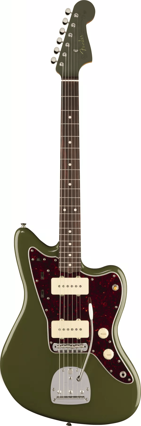 Vintage-Style 50s Jazzmaster single-coil pickups deliver wide, open tones with clarity and warmth, supported by the traditional dual-circuit wiring that lets you switch between lead and rhythm sounds on the fly. A floating tremolo system adds expressive shimmer, while the gold anodised aluminium pickguard and Olive finish complete the retro aesthetic.
