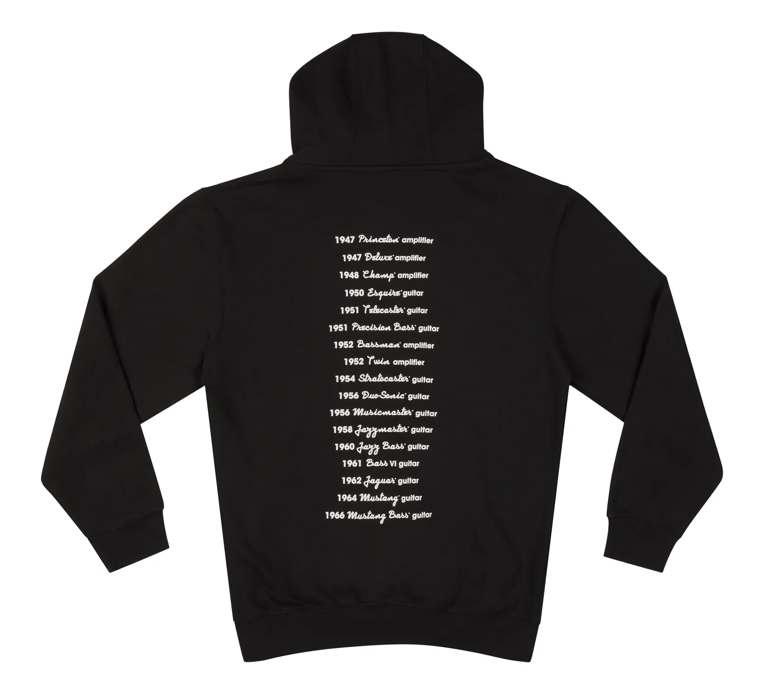 Owning Fender merchandise connects fans to a legendary legacy. We honor our iconic past with a classic Fender transition logo and a tribute to milestone guitar and amp releases spanning from 1947 to 1966. This collection builds on our top-selling apparel, expanding the brand in bold, authentic ways. The hoodie flexes our iconic logo up front and legendary gear release dates from 1947 to 1966 on the back — a timeline of tone that changed music forever. Vintage feel, modern edge. Wear the legacy loud! We honor our iconic past with a classic Fender transition logo and a tribute to milestone guitar and amp releases spanning from 1947 to 2019. This collection builds on our top-selling apparel, expanding the brand in bold, authentic ways. The hoodie flexes our iconic logo up front and legendary gear release dates from 1947 to 2019 on the back — a timeline of tone that changed music forever. Vintage feel, modern edge. Wear the legacy loud! Front- Transition logo, Back- Fender guitar & amp release dates Cotton blend Machine wash cold water Tumble dry low Do not bleach, do not iron Sizes: Unisex S-XXL
