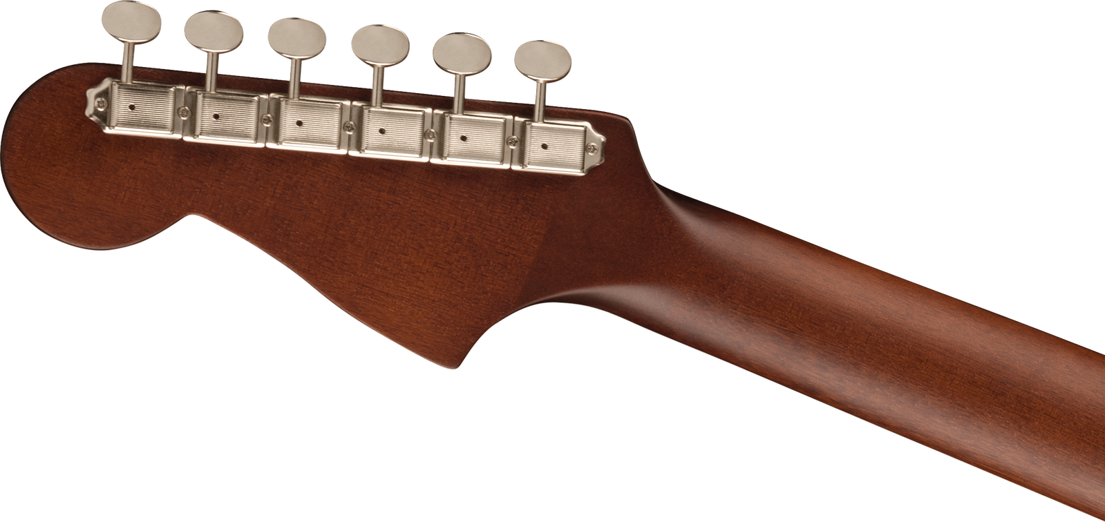 Crafted with an X-braced solid spruce top and sapele back and sides, the Malibu Player's compact parlor-sized body produces a sweet and articulate voice, inspiring players to experiment with new chords and melodies. Its comfortable feel and inviting sound make it the perfect companion for your musical journey. The nato neck features an easy-to-play slim "C"-shaped profile, a short 24" scale length, and a tilt-back 6-in-line headstock—a distinctive nod to Fender's electric guitar DNA.