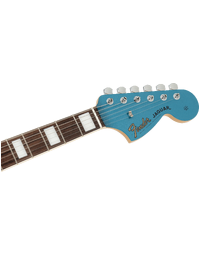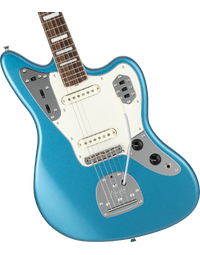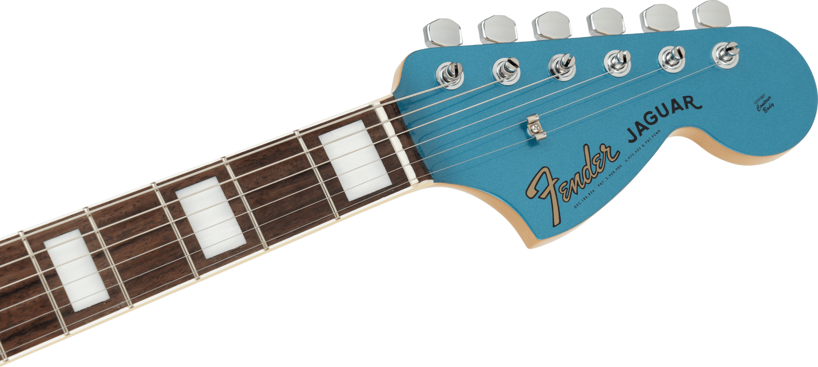 The U-shaped maple neck and bound rosewood fingerboard with block inlays recreate the look and feel of a late-1960s original, while the 9.5-inch radius offers smoother playability than vintage-spec instruments. A floating tremolo and six-saddle vintage-style bridge complete the classic Jaguar setup, ideal for expressive vibrato and precise intonation.