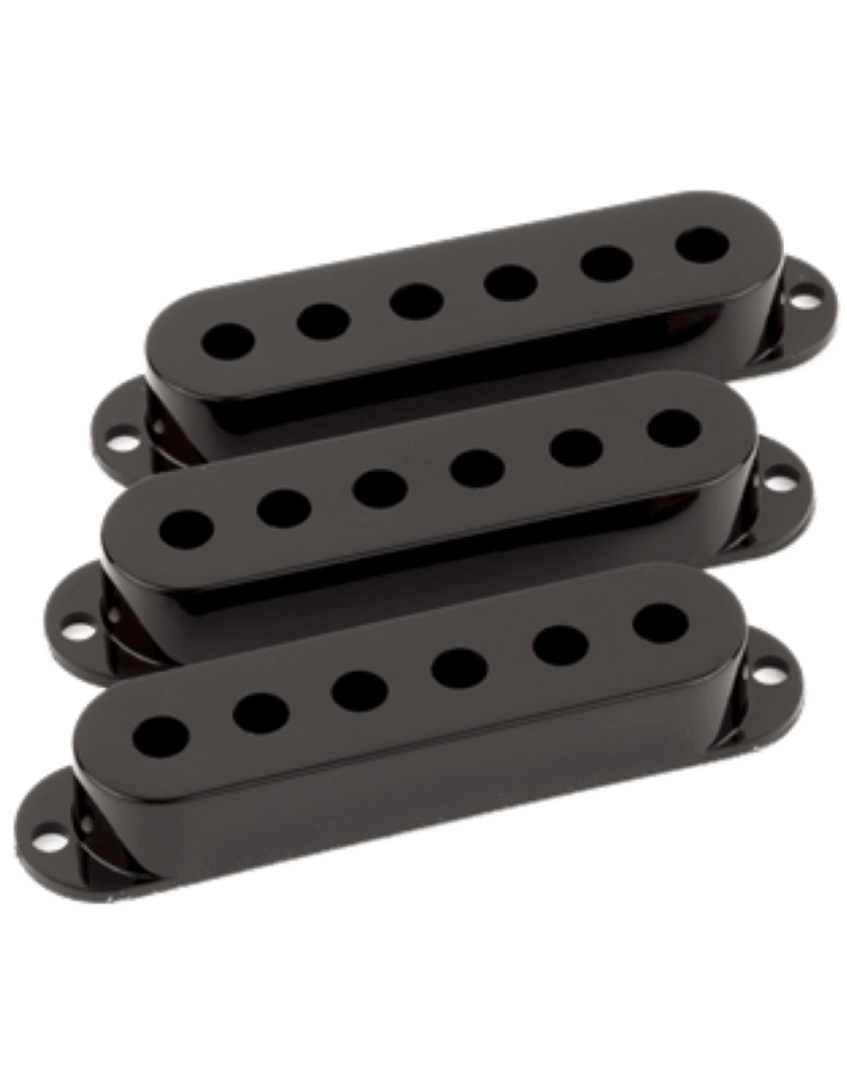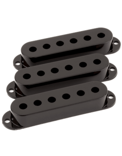 Introducing the Fender Pickup Cover Set for Stratocaster in black, consisting of three covers that can fit most vintage and contemporary Stratocaster models, except SCN, N3 and Noiseless pickups. These covers come in black, in a set of three.