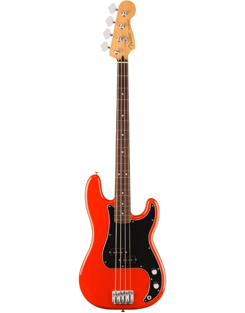 Discover the vibrant tone and performance of the Fender Player II Precision Bass RW in Coral Red. This striking bass combines classic Fender aesthetics with modern enhancements tailored for today's musicians. The contoured alder body, finished in an eye-catching Coral Red, delivers a resonant and balanced sound. The Modern C-profile neck, coupled with a smooth satin urethane finish, provides fast and comfortable playability. The 9.5"-radius rosewood fingerboard with rolled edges and 20 medium jumbo frets ensures effortless fretting and fluid movement. Equipped with a Player Series Alnico V Split-Coil Precision Bass pickup, it offers a full tonal range from deep, powerful lows to clear, articulate highs. The adjustable 4-saddle bridge and open-gear tuners guarantee precise tuning and stability.