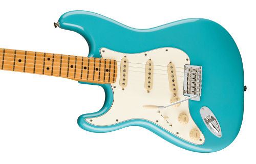 Elevate your performance with the Fender Player II Stratocaster Left-Handed in Aquatone Blue, a stunning instrument designed to meet the demands of today's players. Featuring a contoured alder body, this Strat combines classic Fender aesthetics with modern enhancements. The Modern C-profile neck, with its silky satin urethane finish, ensures effortless playability, while the 9.5"-radius maple fingerboard with smooth rolled edges and 22 medium jumbo frets offers a comfortable and responsive playing experience.