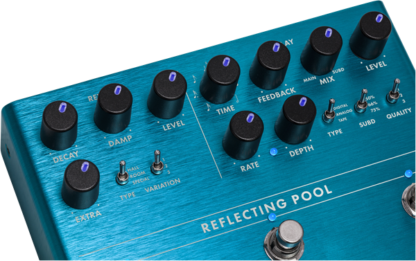 The relationship between time-based effects, like delay and reverb, is critical to operating them correctly. The Reflecting Pool Delay/Reverb pedal combines these two classic effects into one comprehensive chassis, making it easy to integrate into any pedalboard. Utilizing cutting-edge DSP for rich and complex algorithms, the Reflecting Pool faithfully recreates classic sounds, while also conjuring otherworldly new ones. Type, Variation and Quality controls make it easy to precisely shape your sound, the Time toggle adds rhythmic subdivisions, and the Tap Tempo footswitch makes sure everything stays in time.