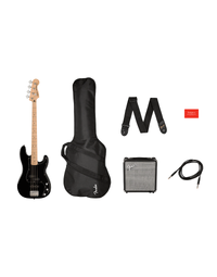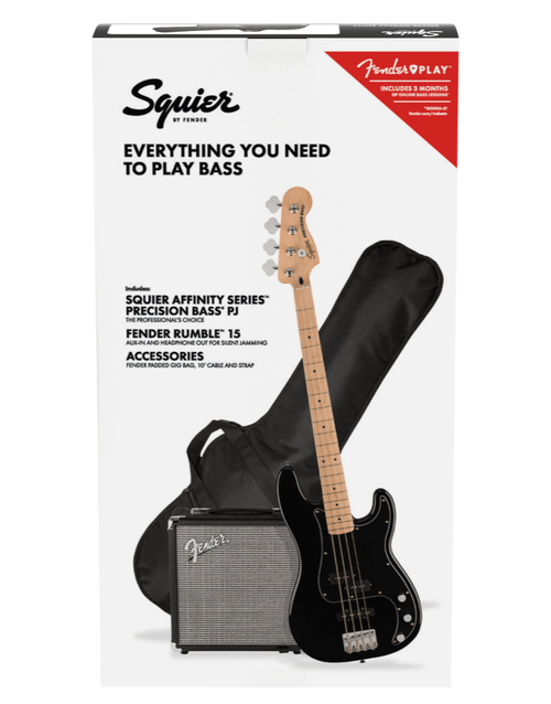 The Fender Squier Precision Bass PJ Pack, finished in Black, is ideal for beginner bassists, with everything you need to plug in and play in the one package. The Precision Bass pack includes a Fender Squier Affinity Precision Bass PJ, Fender Rumble 15 bass amp, Fender padded gigbag, Fender strap,Fender 10' cable, and a 3 month subscription to Fender Play.