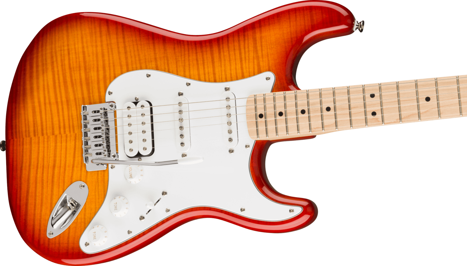At Riffs & Licks Music, we think the Fender Squier Affinity Stratocaster FMT HSS MN, in Sienna Sunburst, is a great option for beginner and intermediate guitarists - a high quality instrument with a super versatile pickup combination and a head-turning Flame Maple finish, at an affordable price.
