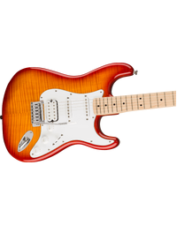The Fender Squier Affinity Stratocaster FMT HSS MN, finished in Sienna Sunburst, is the perfect introduction to guitar, delivering legendary design and quintessential Fender tone. With a thin, lightweight body, and a slim, comfortable and easy to play C-shaped Maple neck, the Affinity Strat offers hours of comfortable playability, whether practicing at home, recording in the studio, or performing on stage. A 2-point tremolo provides players with superior tremolo action and sealed die-cast tuning machines with split shafts offer smooth, accurate tuning and easy restringing. An eye-catching Flame Maple top caps a Poplar body, for well-rounded and expressive tone - and it looks incredible finished in Sienna Sunburst. With a pair of Squier ceramic single-coil pickups in the neck and middle positions, and a Squier ceramic humbucking pickup in the bridge, the Affinity Strat has a huge range of sonic variety, great for anything from clean, jazzy licks, to gained-up rock riffs.