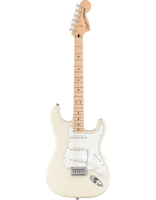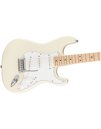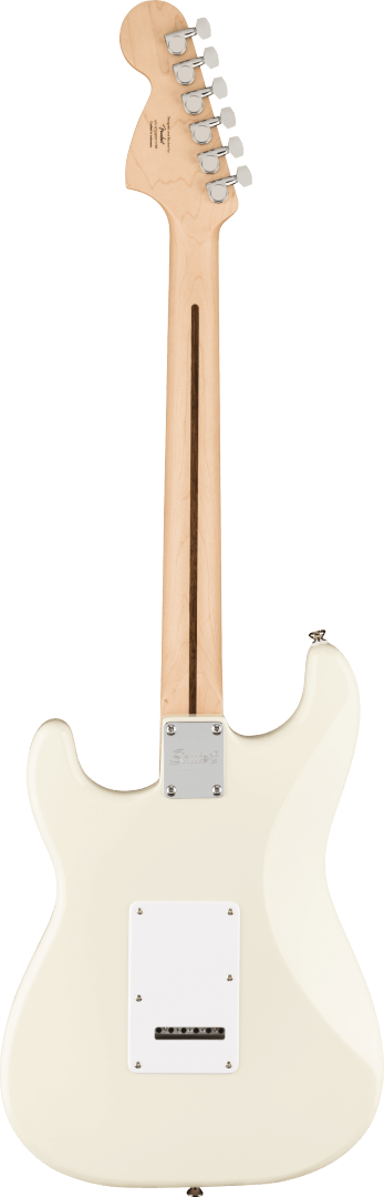 The Fender Squier Affinity Stratocaster MN, finished in Olympic White, is the perfect introduction to guitar, delivering legendary design and quintessential Fender tone. With a thin, lightweight body, and a slim, comfortable and easy to play C-shaped Maple neck, the Affinity Strat offers hours of comfortable playability, whether practicing at home, recording in the studio, or performing on stage. A 2-point tremolo bridge provides players with superior tremolo action and sealed die-cast tuning machines with split shafts offer smooth, accurate tuning and easy restringing. A trio of Squier ceramic single-coil pickups offer a wide range of sonic versatility, great for anything from clean, jazzy licks, to gained-up rock riffs.