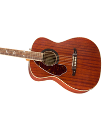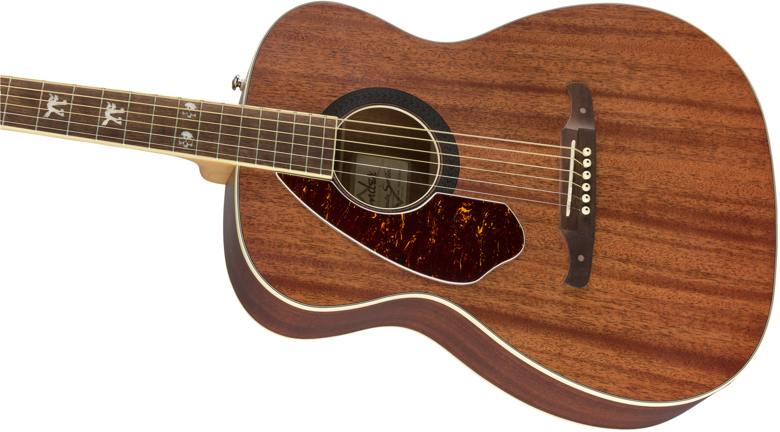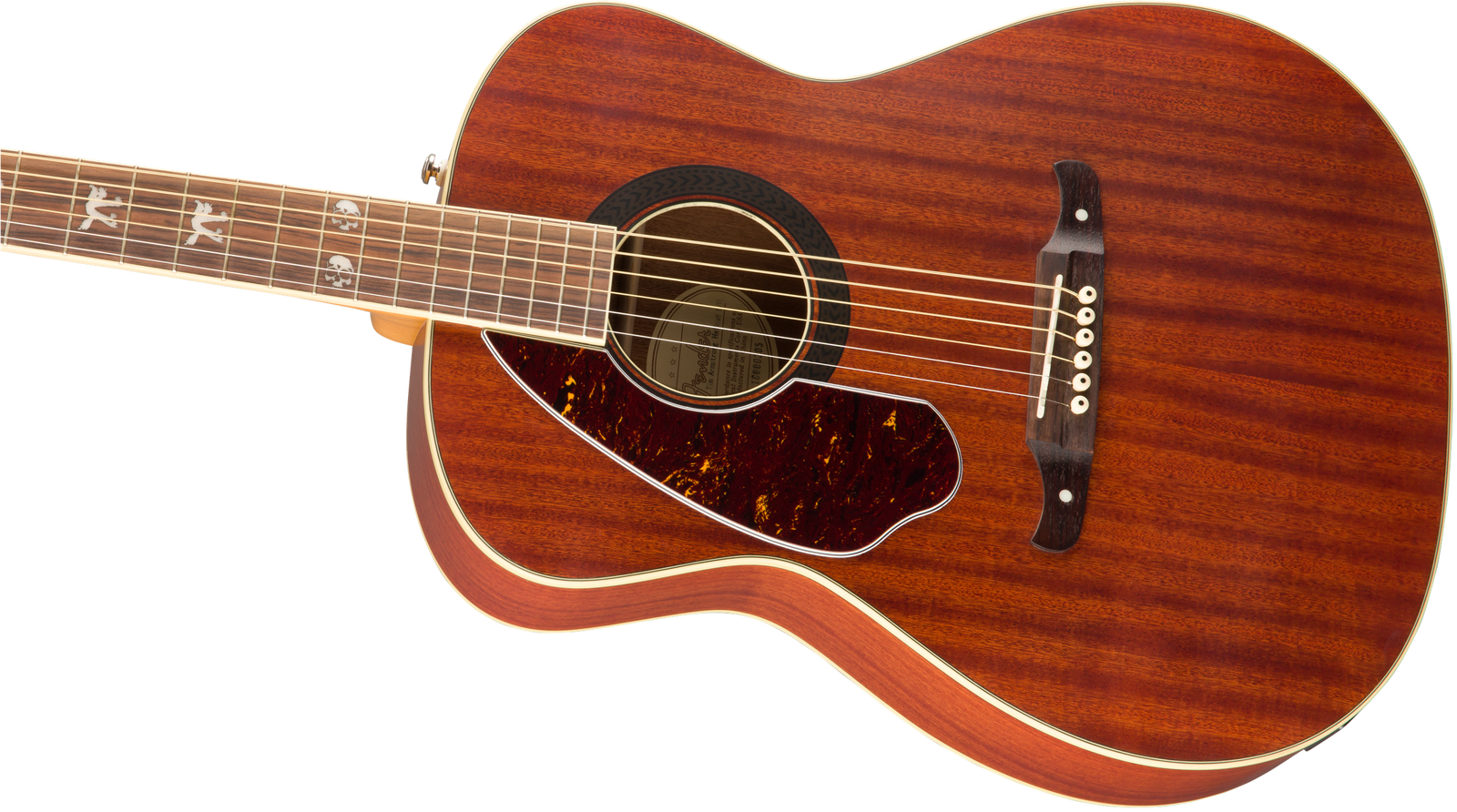 The Fender Tim Armstrong Signature Hellcat Left-Handed Concert acoustic-electric pairs a solid mahogany top with laminated mahogany back and sides for a warm, mid-focused response and controlled low end. A solid mahogany soundboard produces a more individual tonal character than laminated tops, allowing greater dynamic nuance and improved projection. Scalloped X bracing reduces top mass, which helps the soundboard move more freely and increases responsiveness to lighter and more aggressive strumming.