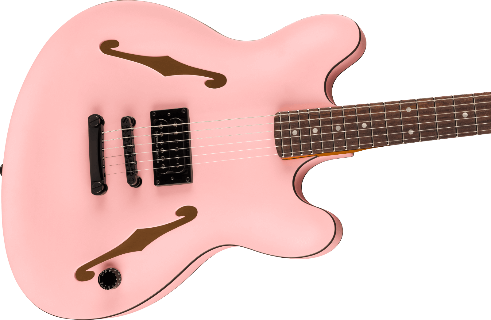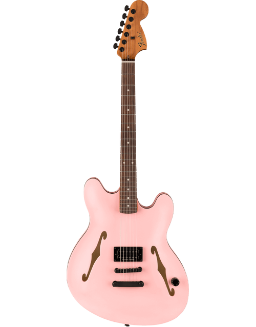 Introducing the Fender Tom DeLonge Starcaster RW Black Hardware in Satin Shell Pink - a celestial collaboration between Blink-182's Tom DeLonge and Fender, crafting an instrument that's as visually striking as it is sonically powerful. With its offset semi-hollow body and Seymour Duncan SH-5 Duncan Custom humbucker, this Starcaster delivers turbo-charged tone, perfect for driving power chords and gritty riffs. Its streamlined control setup, featuring a single master volume with treble bleed circuit, ensures the guitar's natural high-end remains intact, delivering sparkling cleans and dynamic breakup tones. The modern "C" neck with medium jumbo frets offers exceptional playability, while Fender locking tuners and a fully adjustable bridge guarantee rock-solid tuning stability. Adorned with DeLonge's signature artwork on the back of the headstock and the neck plate, this Starcaster is a must-have for fans, players, and collectors alike.