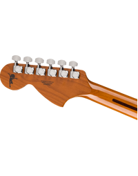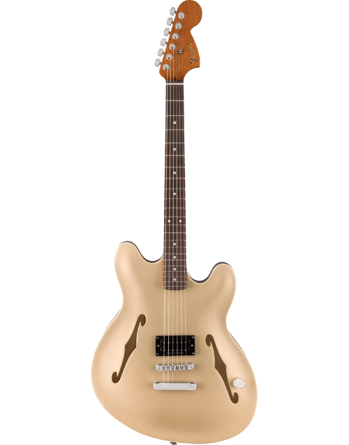 Introducing the Fender Tom DeLonge Starcaster RW Chrome Hardware in Satin Shoreline Gold - a collaboration between the iconic Blink-182 guitarist and Fender, delivering an instrument of otherworldly character and tone. Featuring an offset semi-hollow body, this guitar houses a Seymour Duncan SH-5 Duncan Custom humbucker for explosive power and clarity. Its streamlined control setup, including a single master volume with treble bleed circuit, ensures pristine cleans and edgy breakup tones. The modern "C" neck with medium jumbo frets offers superb playability, while Fender locking tuners and a fully adjustable bridge enhance tuning stability. Adorned with DeLonge's signature artwork, this Starcaster is a must-have for fans and collectors alike.