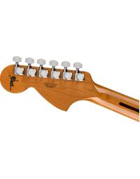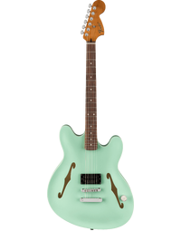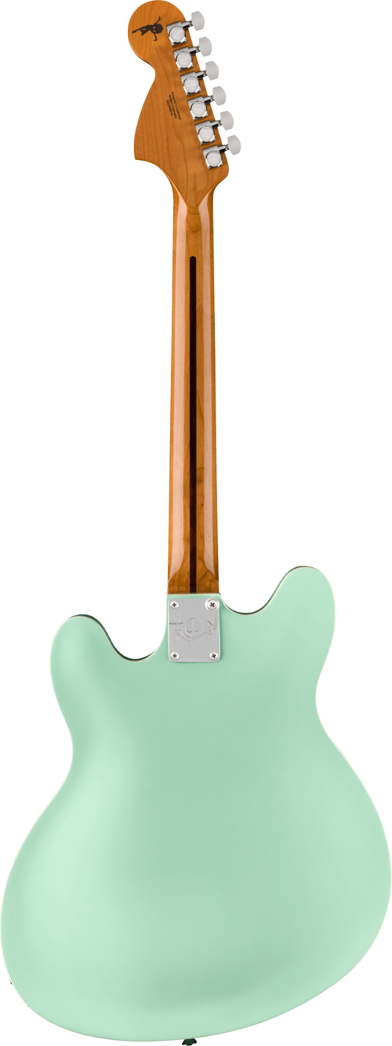 Introducing the Fender Tom DeLonge Starcaster RW Chrome Hardware in Satin Surf Green - a celestial collaboration between Blink-182's Tom DeLonge and Fender, delivering a guitar that's out of this world. With its offset semi-hollow body and Seymour Duncan SH-5 Duncan Custom humbucker, this Starcaster roars with turbo-charged tone, perfect for chunky power chords and crunchy riffs. The streamlined control setup, featuring a single master volume with treble bleed circuit, ensures sparkling cleans and chime-y edge-of-breakup tones. Crafted for comfort, the modern "C" neck with medium jumbo frets offers superior playability. With Fender locking tuners and a fully adjustable bridge, tuning stability is rock-solid. Complete with DeLonge's signature artwork on the back of the headstock and the neck plate, this Starcaster is a must-have for fans and collectors alike.