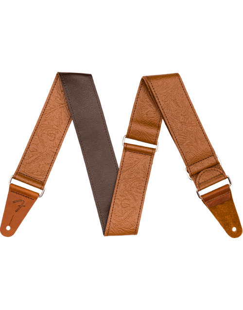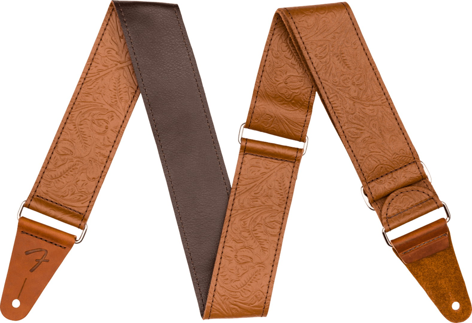 Introducing the Fender Brown Tooled Leather Strap, a stylish accessory that draws inspiration from the intricate straps favored by country and Western swing musicians. The floral pattern on this 2”-wide strap is eye-catching and adds a classic touch to any performance. Its premium leather cone ends feature an embossed “F” logo that complements the theme. The strap's silver nickel slider allows players of any height to adjust the length between 42”-52” for comfort. This strap is a must-have for any guitarist with quality, comfort, and aesthetics in mind.