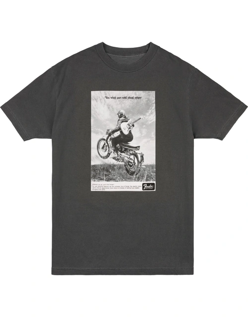 Launched in 1960 Fender's, "You won't part with yours either" campaign was aimed at guitar players who cherish their Fender guitars, and the deep emotional connection that musicians often develop with their instruments. Be a part of Fender's history while wearing your vintage black t-shirt with motorcycle rider graphic from this iconic vintage ad. Now you are ready to Hit the Open Road!!