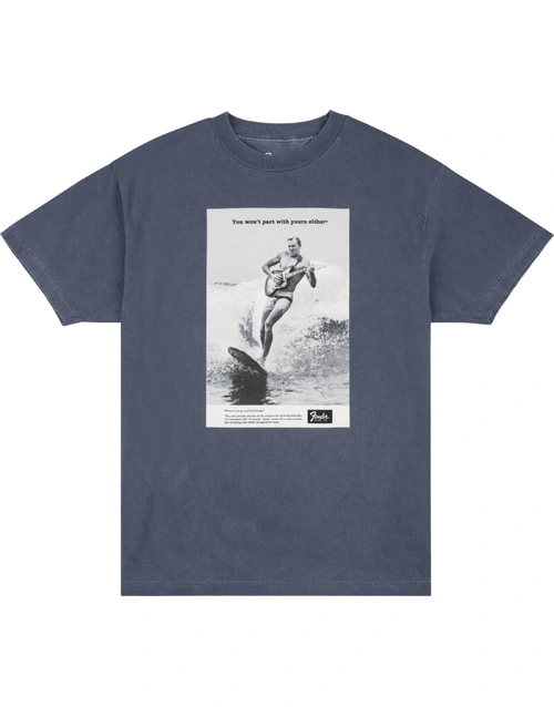 Launched in 1960 Fender's, "You won't part with yours either" campaign was aimed at guitar players who cherish their Fender guitars, and the deep emotional connection that musicians often develop with their instruments. Be a part of Fender's history while wearing your ocean blue t-shirt with surfer graphic from this iconic vintage ad. Surfs Up!!