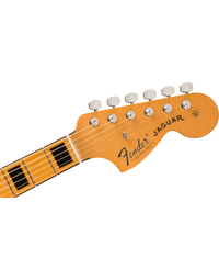 Crafted with an alder body and a maple neck, this Jaguar resonates with classic Fender punch and clarity. The late-'70s "C"-shape neck offers a familiar and comfortable grip, while the vintage-tall frets on the 7.25" radius bound maple fingerboard provide the perfect platform for expressive vibrato and big bends. Black block inlays and binding contribute to the premium '70s aesthetic.