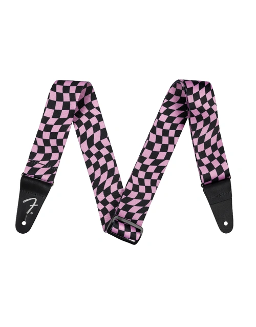 The Fender Wavy Checkerboard Polyester Strap in Pink offers both comfort and style for any guitarist. Featuring a bold wavy checkerboard design, this strap is made from smooth polyester for durability and long-lasting performance. The 2" width provides excellent support, while the adjustable length (from 34" to 59") ensures a comfortable fit for players of all sizes. Finished with alternate Fender "F" white/black leather ends, this strap showcases iconic Fender quality and style. Made in Canada, it’s designed to stand up to the demands of performance while adding a fun and unique flair to your instrument. At Riffs & Licks Music, we think this strap is perfect for players looking to combine comfort with eye-catching design.