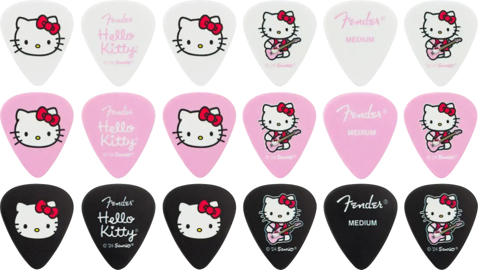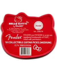 Add a playful touch to your playing with the Fender x Hello Kitty Pick Tin. This collector's tin, shaped like Hello Kitty, holds 18 medium-gauge celluloid picks adorned with iconic Hello Kitty and Fender branding. Designed in the classic 351 shape, these picks offer reliable grip and smooth playability, while the reusable tin makes it a practical and stylish keepsake. Perfect for Hello Kitty fans and collectors, this pick tin is a charming blend of function and fun.