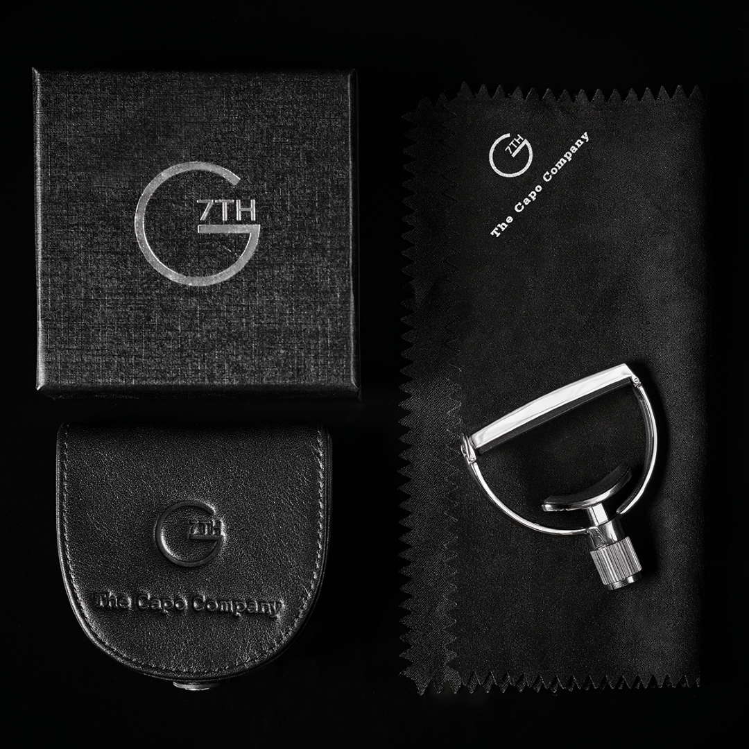 The Heritage is a traditional yoke-style capo made from hand-polished stainless steel and features G7th's patented Adaptive Radius Technology (ART) string pad. With force exerted from the centre of the guitar neck, the ART string pad can perfectly distribute the pressure over all six strings by adapting to match the radius of the fingerboard. Every Heritage comes with a leather pouch, polishing cloth and gift box. Available in standard and wide widths for guitar and banjo, and for 12 string guitars.
