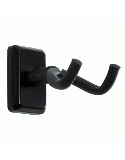 Frameworks Wall Mounted Guitar Hanger with Black Mounting Plate. Fits Electric, Acoustic & Bass Guitar Neck Widths up to 2"/51mm. Rubberized Swivel Yoke to Properly Cradle Guitar Neck.