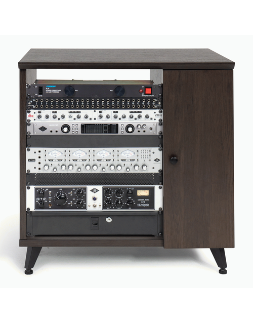 Elite Furniture Series Rolling Rack Sidecar Cabinet in Brown. Configurable Rack Spacing (4, 8 or 12U) Provides Plenty of Room for Preamps, Effects Processors & Similar Pro Audio Gear. Top Surface Provides Great Fit for Turntable, Table-Top Audio Interface or Small Mixer (30"/762mm x 24"/610mm). Optional Height-Adjustable Slide-Out Tray Features Soft-Close Drawer Slides with Underside Grip - Fits Small MIDI Controllers & Drum Machines.