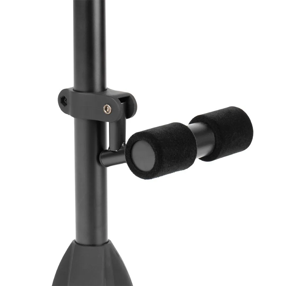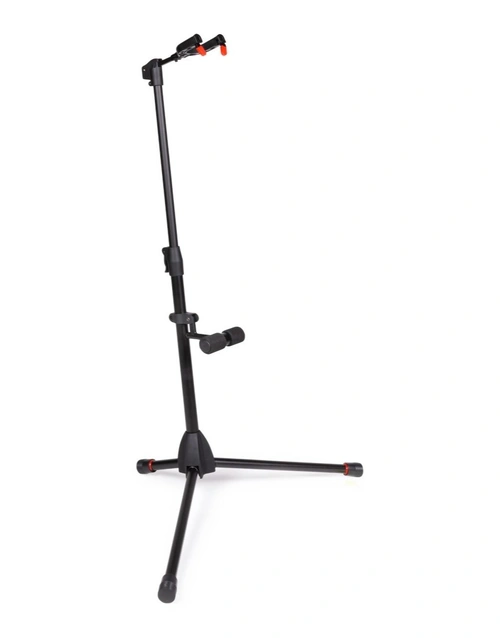 The self-locking guitar stand by Gator Frameworks saves you a trip to the luthier. A specially designed yoke keeps your guitar from falling out with its integrated self-locking mechanism. When attached, the weight of the guitar activates dual rubberized guards, keeping it secured to the stand. A padded body cradle at the bottom prevents scratches by preventing any unwanted contact between instrument and metal. To set the stand at the perfect height, simply locate the locking cam lever and perform adjustments as needed. The stand also travels easily with its collapsible base, folding neck yoke and folding body cradle.