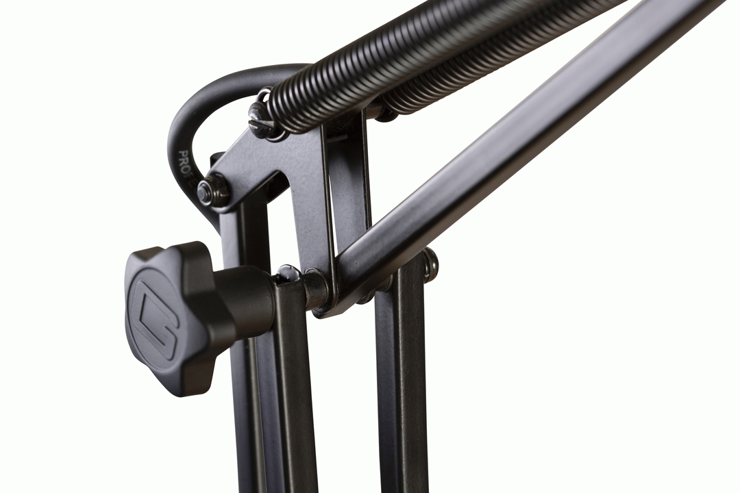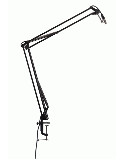 Desk-Mounted Broadcast Microphone Boom Stand for Podcasts & Recording. Fixed 10’/3.05m XLR Cable Included for Clean Look & Organization. Spring-Loaded Articulating Arm with 2.20 lbs./1.18 kg Weight Capacity & 38.5"/978mm Max Extension. Full 360-Degrees Rotational Adjustment with Minimal Noise. Easily Mounts or Clamps to Desks, Tables & Similar-Size Surfaces 2.17"/55mm Max in Thickness. 70mm Mic Threads at Boom End. Black Powder-Coated Steel Construction with Metal Coil Springs. Includes One (1) Surface Mount Kit & One (1) Clamp Kit. Exterior Dimensions: 20.67"/525mm (Lower Arm), 19.29"/490mm (Upper Arm). Net Weight 3 lbs./1.63 kg.
