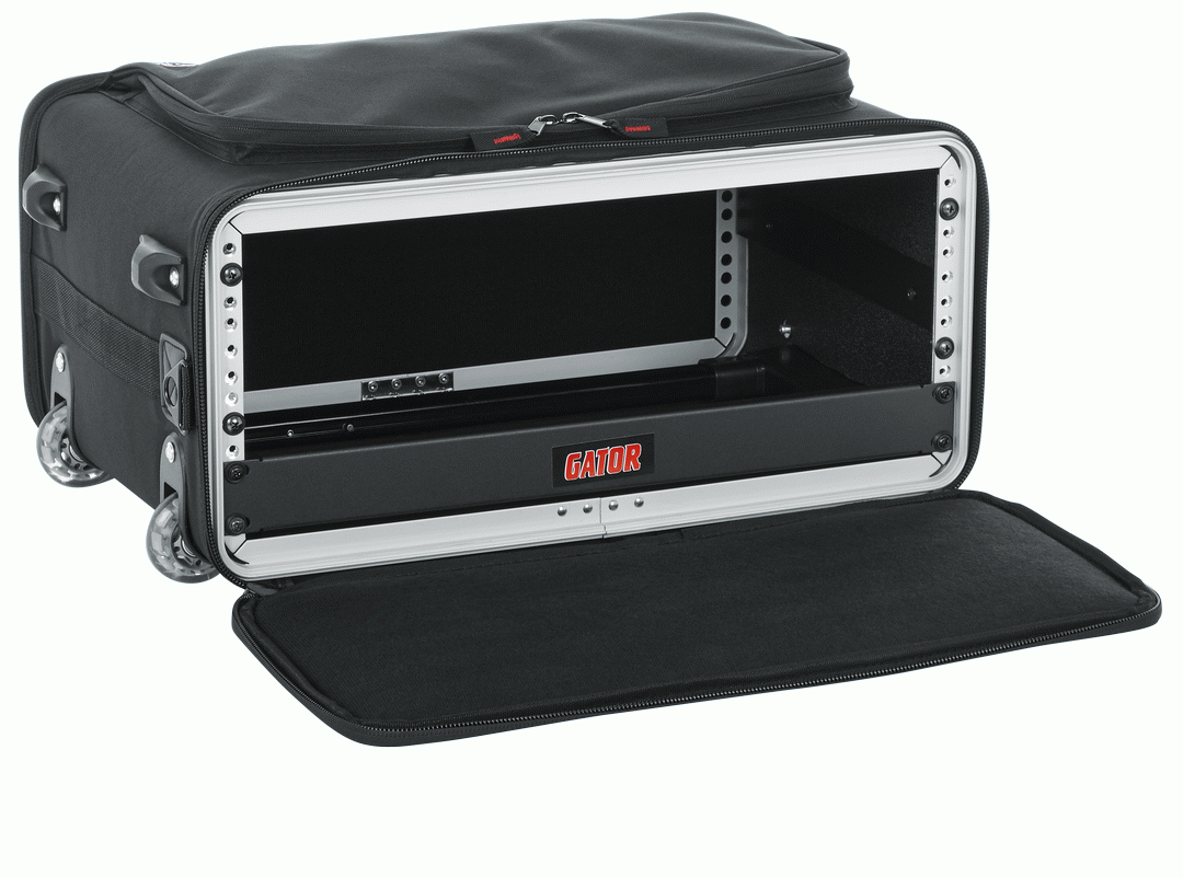 Part of the Gator Cases Protection Range in the Racks - Portable product category - Rack Bags. 3U Lightweight rolling rack bag with retractable tow handle, aluminum frame and PE reinforcement.