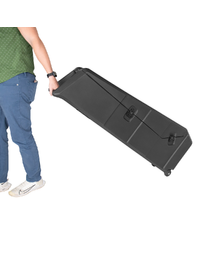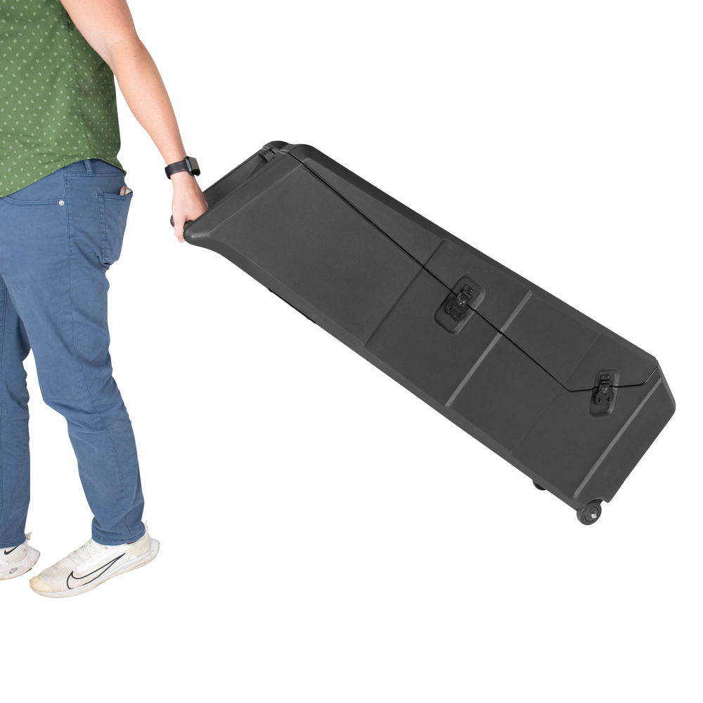Designed to hold two electric bass guitars, it accommodates common shapes like Precision Bass, Jazz Bass, Stingray bass and similar styles, keeping them secure and separated inside the case. The lightweight build, rolling design, and ergonomic handle make it easier to move between venues without unnecessary strain.