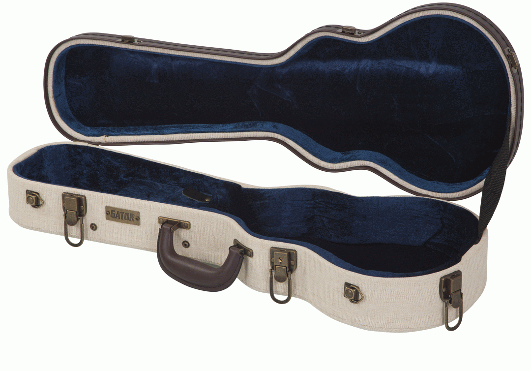 The Gator Journeyman Deluxe Wood Case for concert style ukuleles (GW-JM UKE-CON), offers traditional craftsmanship, modern engineering, and a distinct vintage style. Dressed up in pebble weave burlap, accented with espresso trim, and outfitted with antique brass hardware, its classic elegance is undeniable. Heavy-duty plywood panels create a sturdy outer shell while royal blue crushed velvet and thick foam padding cradle your concert style ukulele securely in place. A single interior storage compartment provides ample space for your favourite strings, picks, and accessories. Keep your prized ukulele safe and stylish with the Gator GW-JM UKE-CON Deluxe Wood Case.