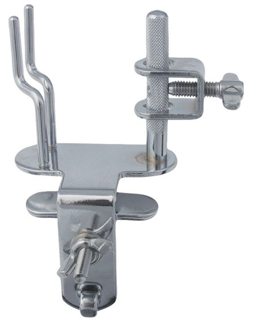 Dual purpose percussion mount clamps on a bass drum counter hoop.
