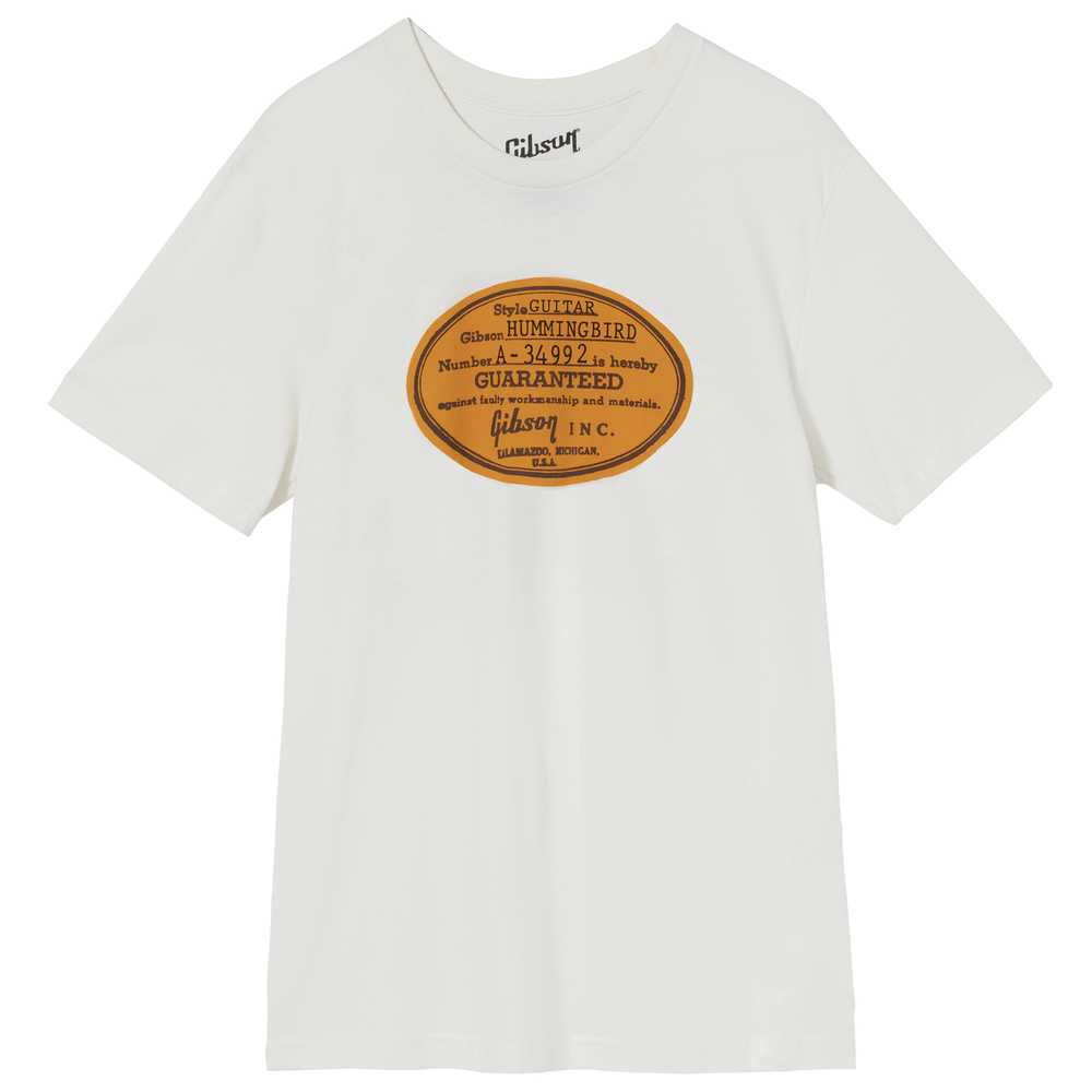 This vintage white tee features an artistic representation of the famous oval orange label that adorns most Gibson Acoustic instruments. The serial number featured is the serial of the first Gibson Hummingbird ever built. (Fact! We looked this up in the ledgers!)