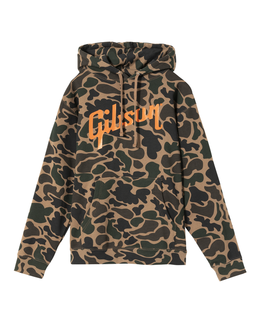 This heavyweight pullover features a duck camo pattern with the Gibson logo in hunter's orange on the front.