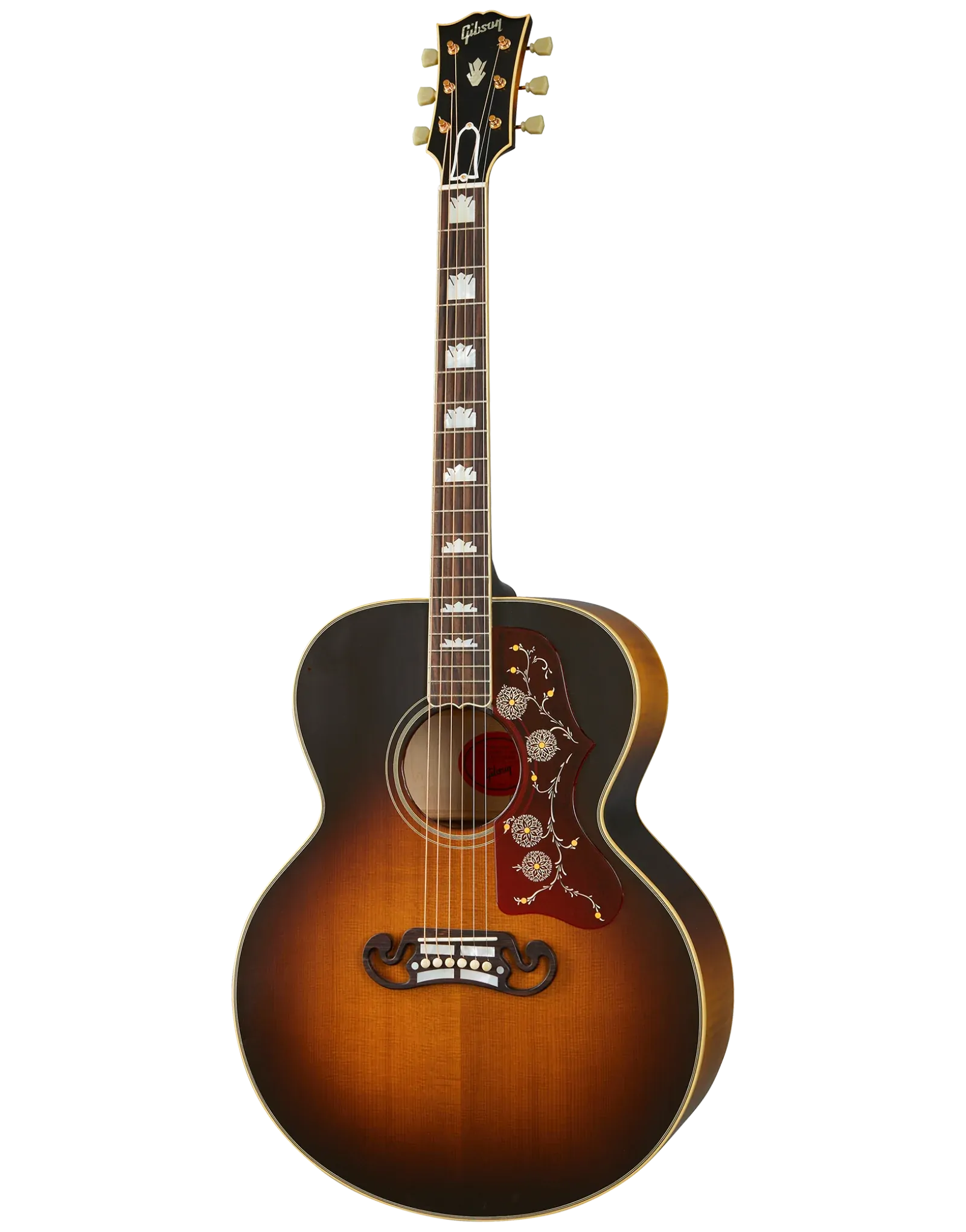 The Gibson Custom Shop 1957 SJ-200 in Vintage Sunburst revives the legendary flat-top acoustic in authentic detail. Built with a thermally aged Sitka spruce top and hand-selected flame maple back and sides, this Super Jumbo offers a rich, room-filling voice with bold lows and crisp highs. Traditional hand-scalloped X-bracing with hide glue maximises tonal response, while a thin nitro VOS finish adds to the vintage feel and resonance. The 2-piece maple neck with a rounded profile and rosewood fretboard provides smooth playability, topped with crown inlays and a classic stinger headstock. Finished with a moustache bridge, casted pickguard, and period-correct case, this is a true heirloom instrument.