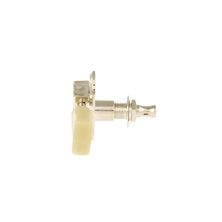 Gibson’s vintage machine heads with pearloid buttons feature solid nickel, closed housing construction, period-correct vintage styling, and traditional pearloid buttons that deliver precise tuning, while adding a luxurious, classic feel to your guitar’s headstock. This OEM part comes in either Nickel or Gold finish. Special note: These tuners feature screw in bushings, which require a larger diameter mounting hole than traditional ‘push in’ bushing tuners.