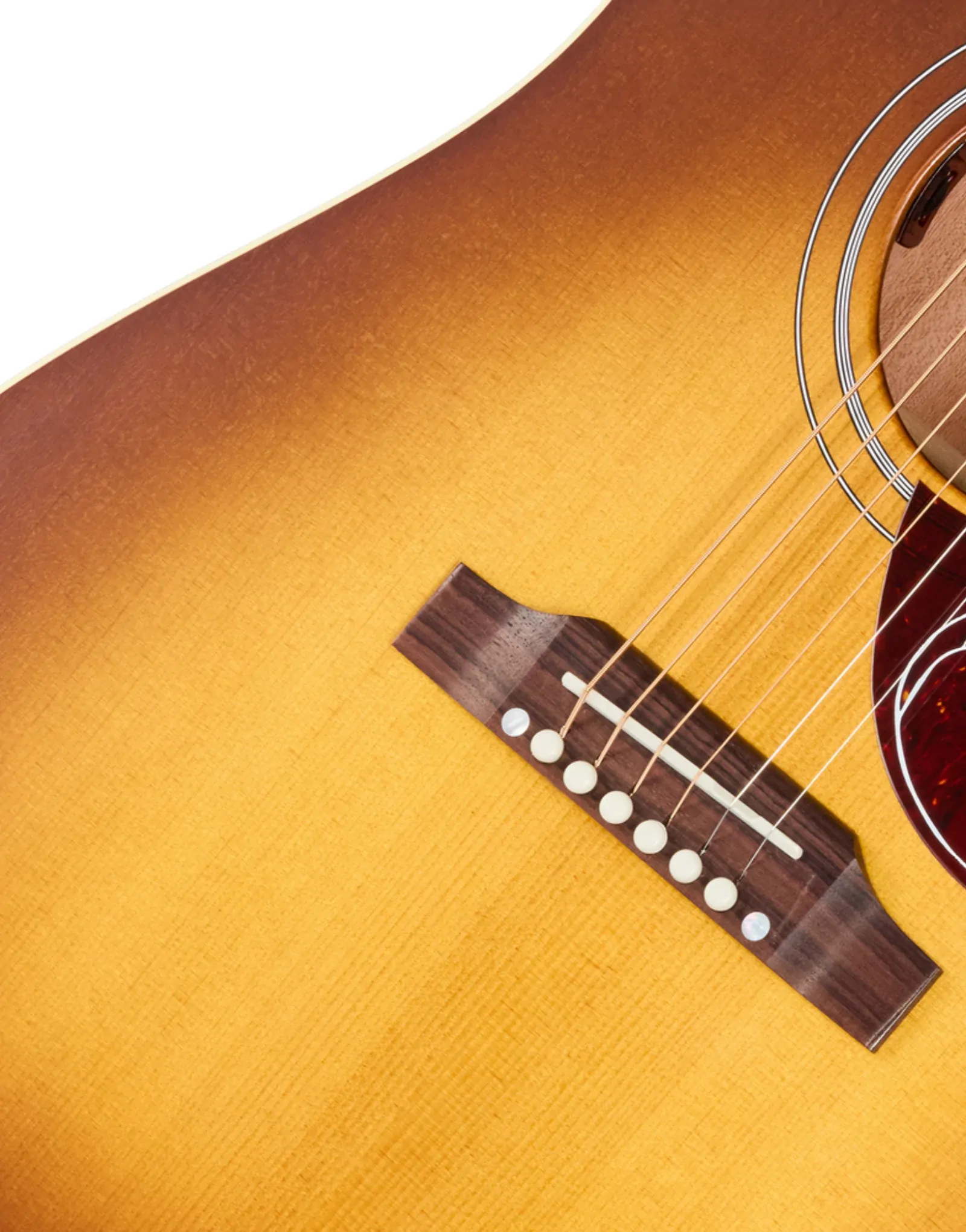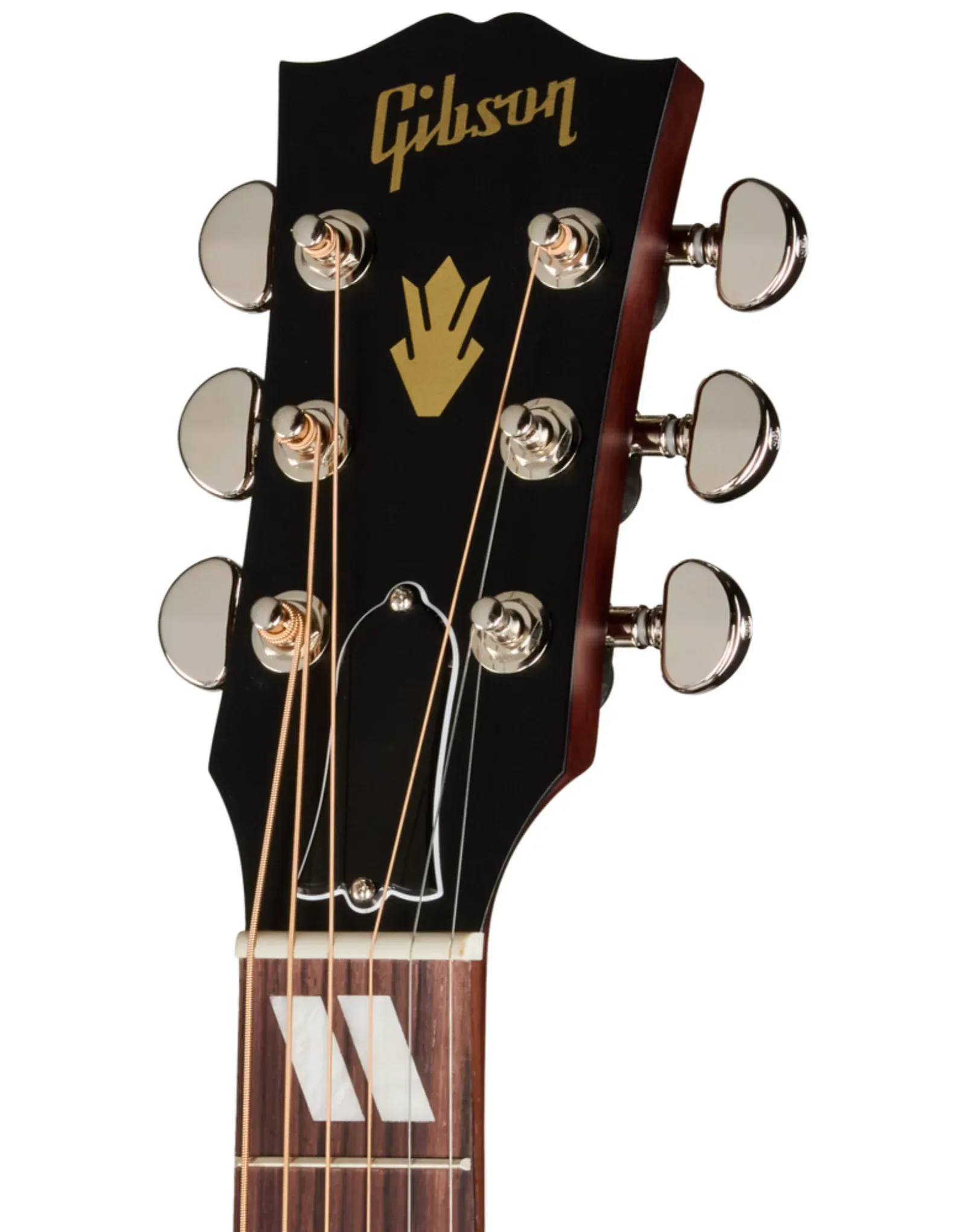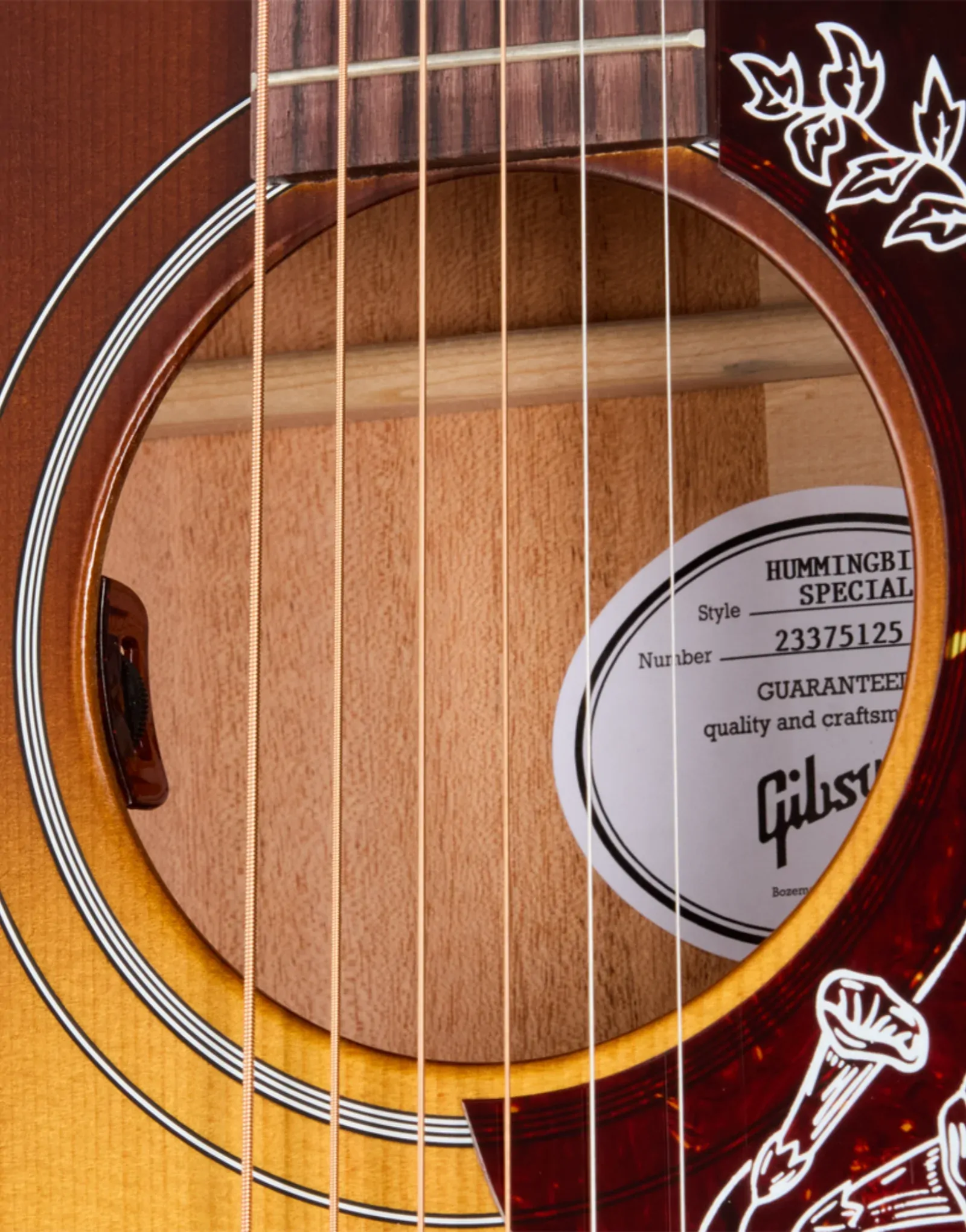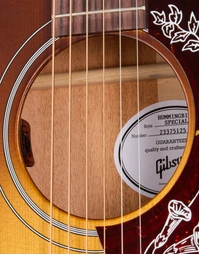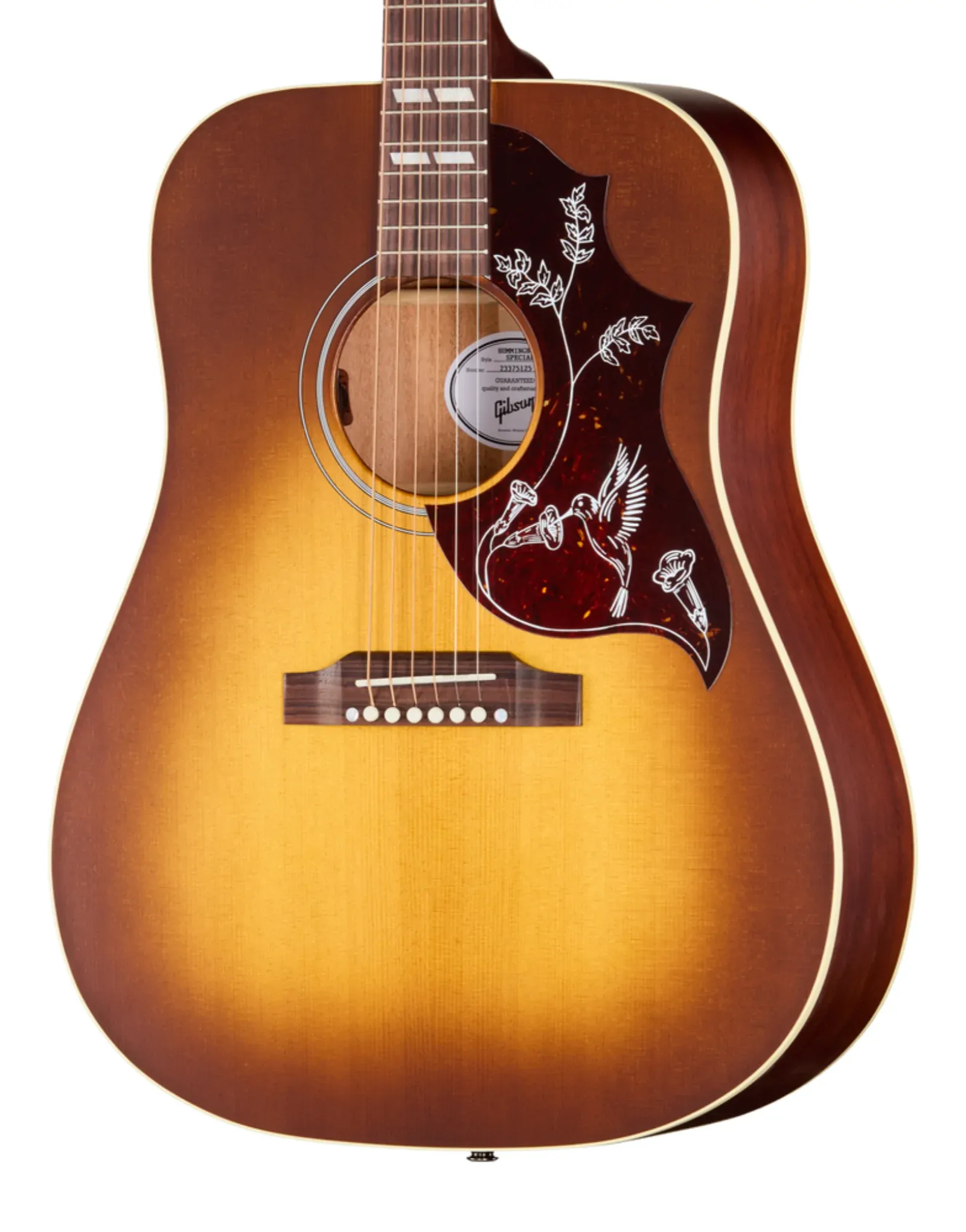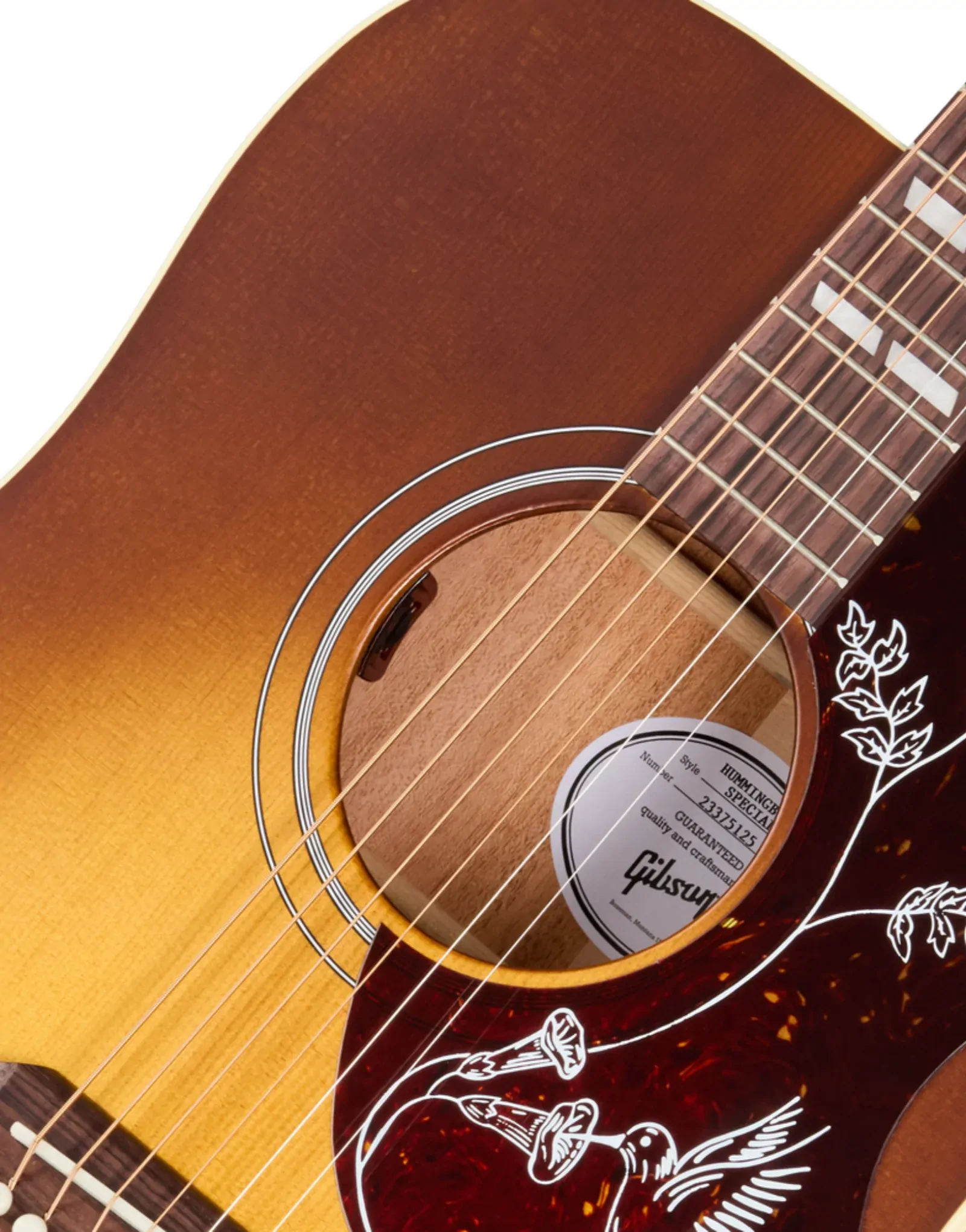 The Gibson Hummingbird Special Satin Honey Burst delivers the unmistakable warmth and midrange presence of this iconic square-shoulder acoustic in a more refined, player-friendly build. A solid Sitka spruce top paired with solid mahogany back and sides produces a balanced, expressive tone with smooth highs and a controlled low end that sits cleanly in a mix.