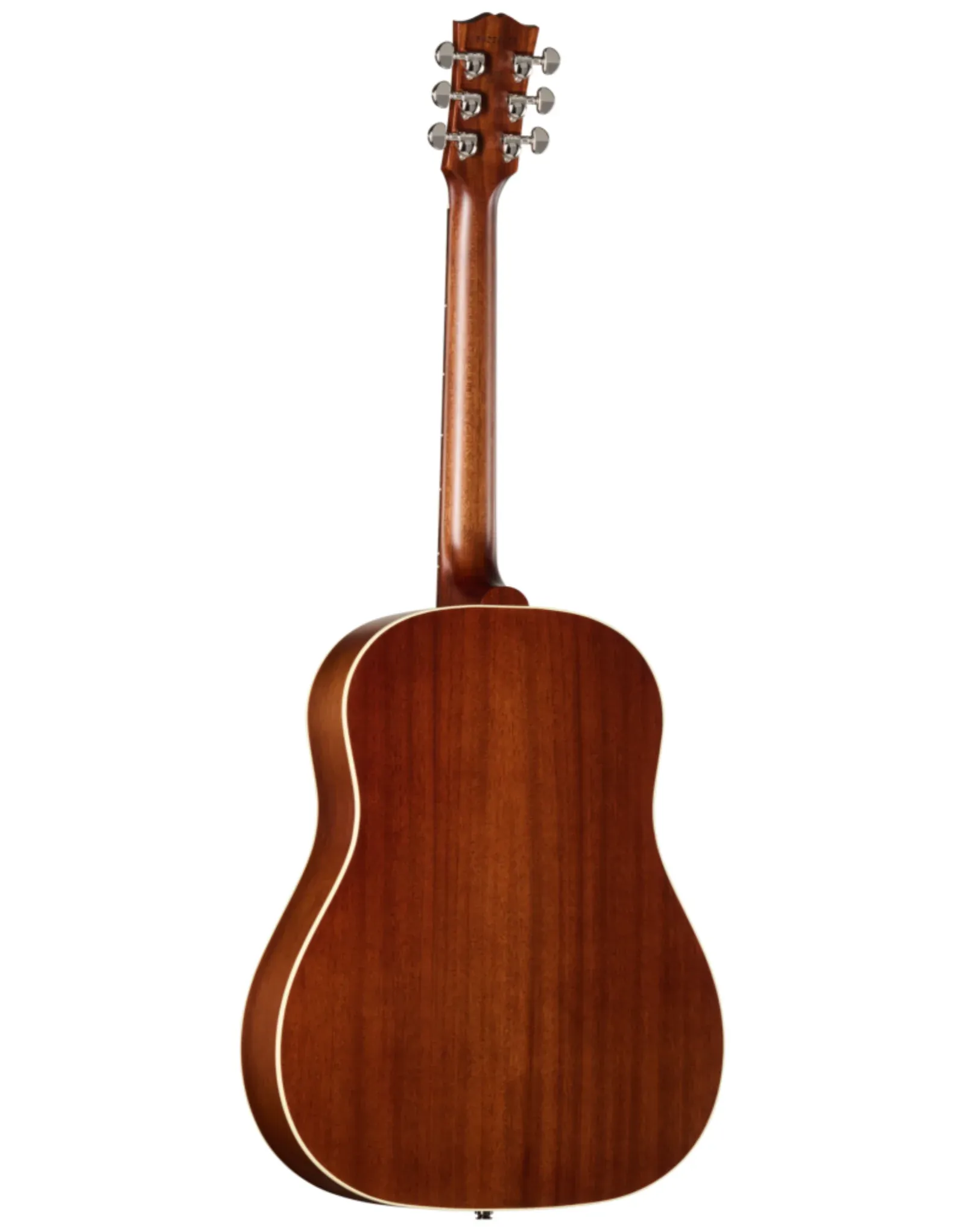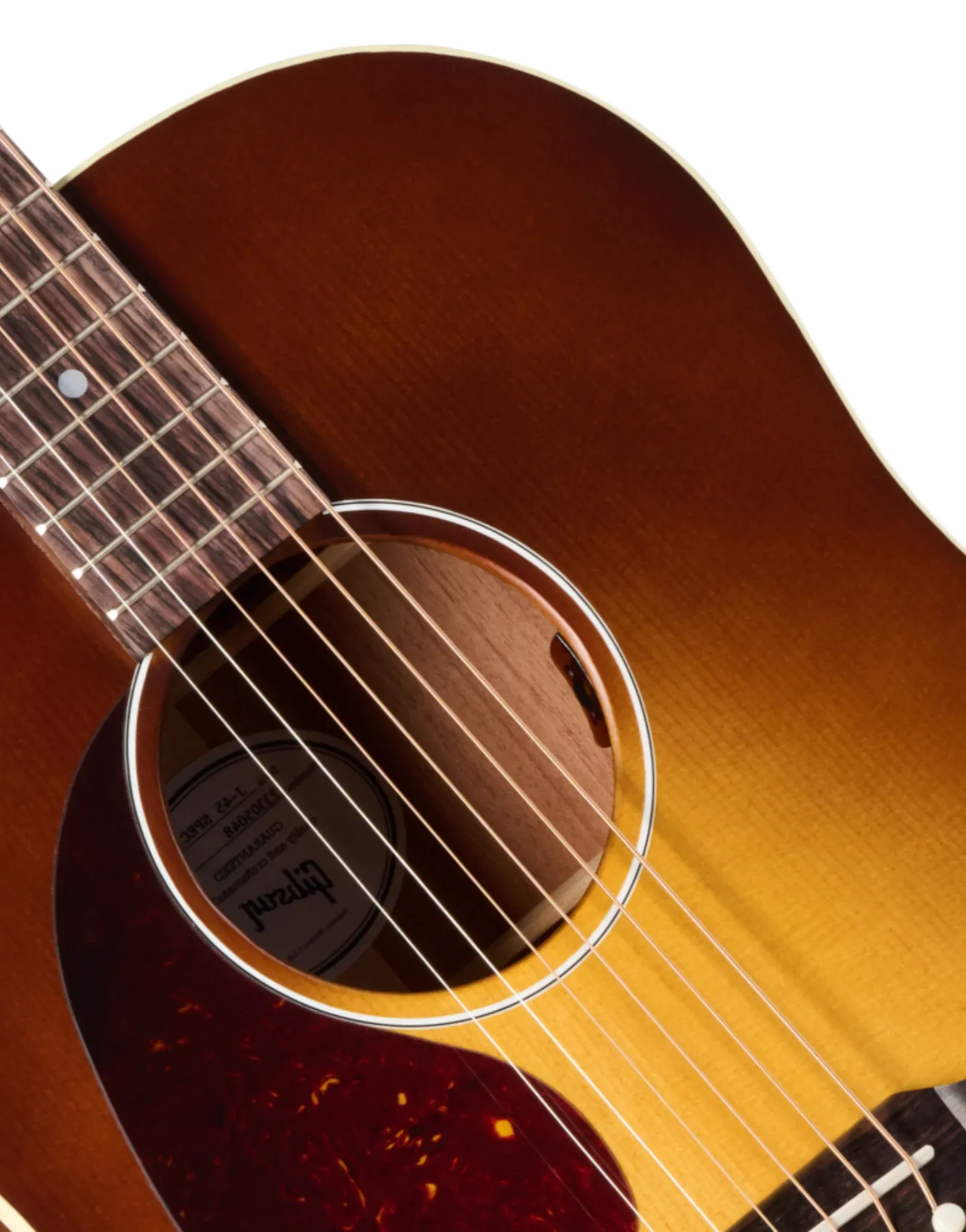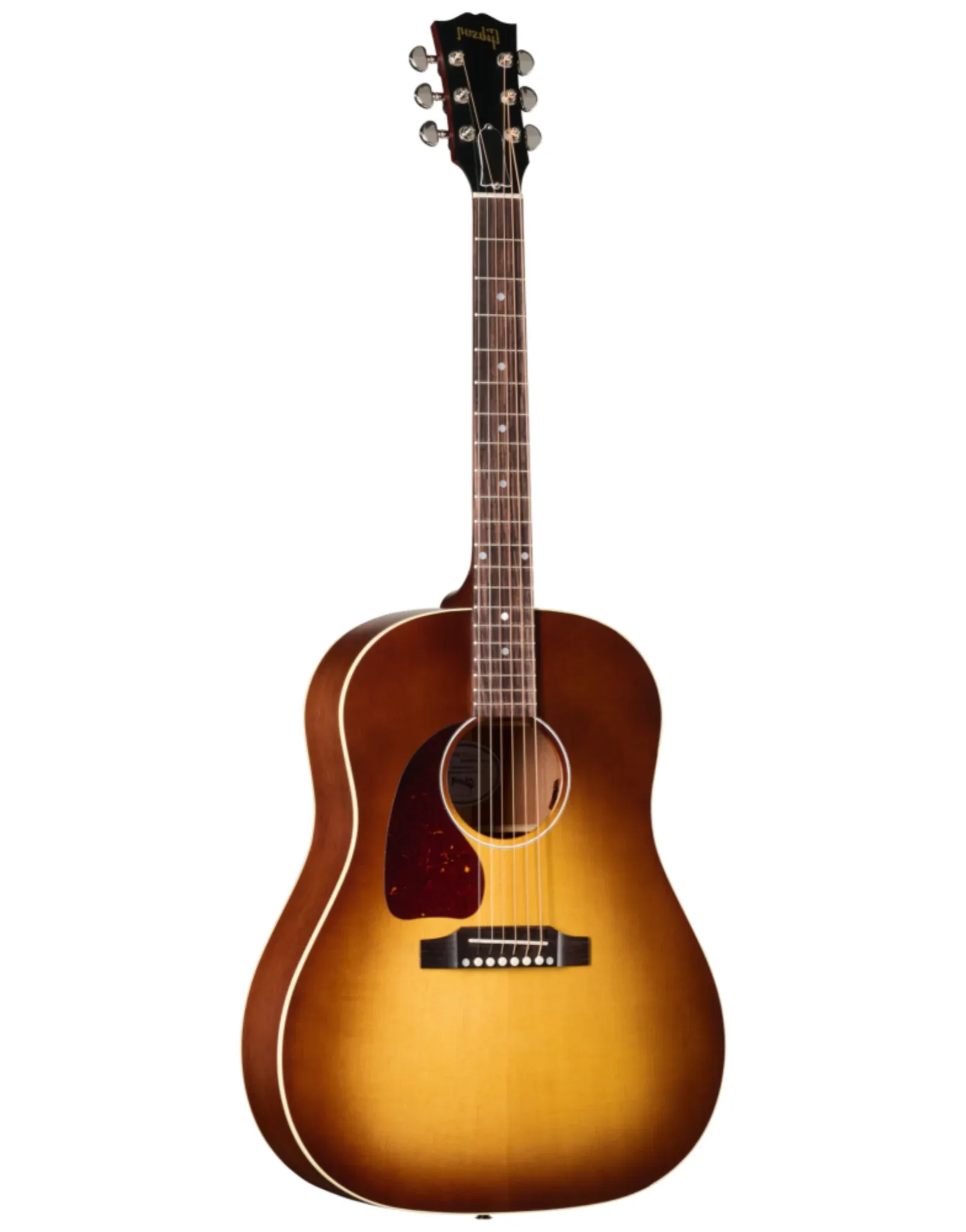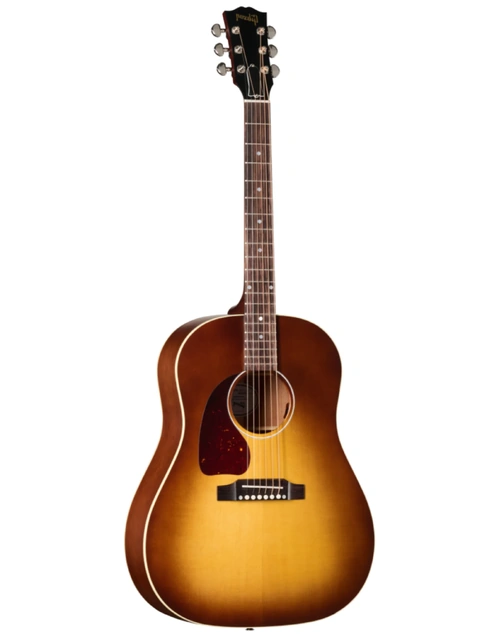 The Gibson J-45 Special Satin Honey Burst Left-Handed brings the classic “Workhorse” sound to southpaw players in a more streamlined, player-friendly build. A solid Sitka spruce top paired with solid mahogany back and sides delivers the warm, balanced tone the J-45 is known for, with clear highs and controlled low end that records cleanly and sits well in a band mix.