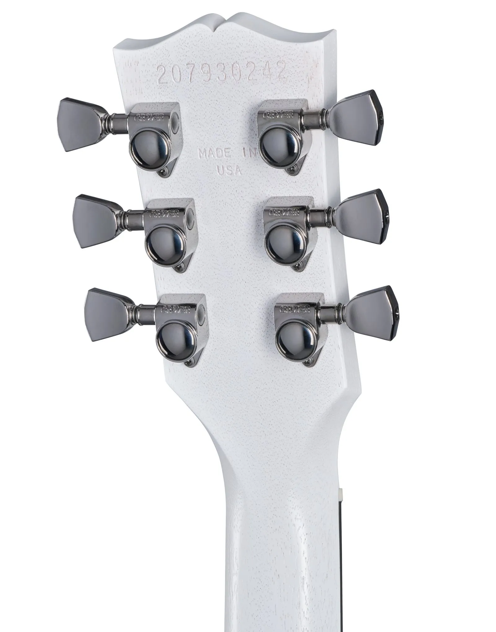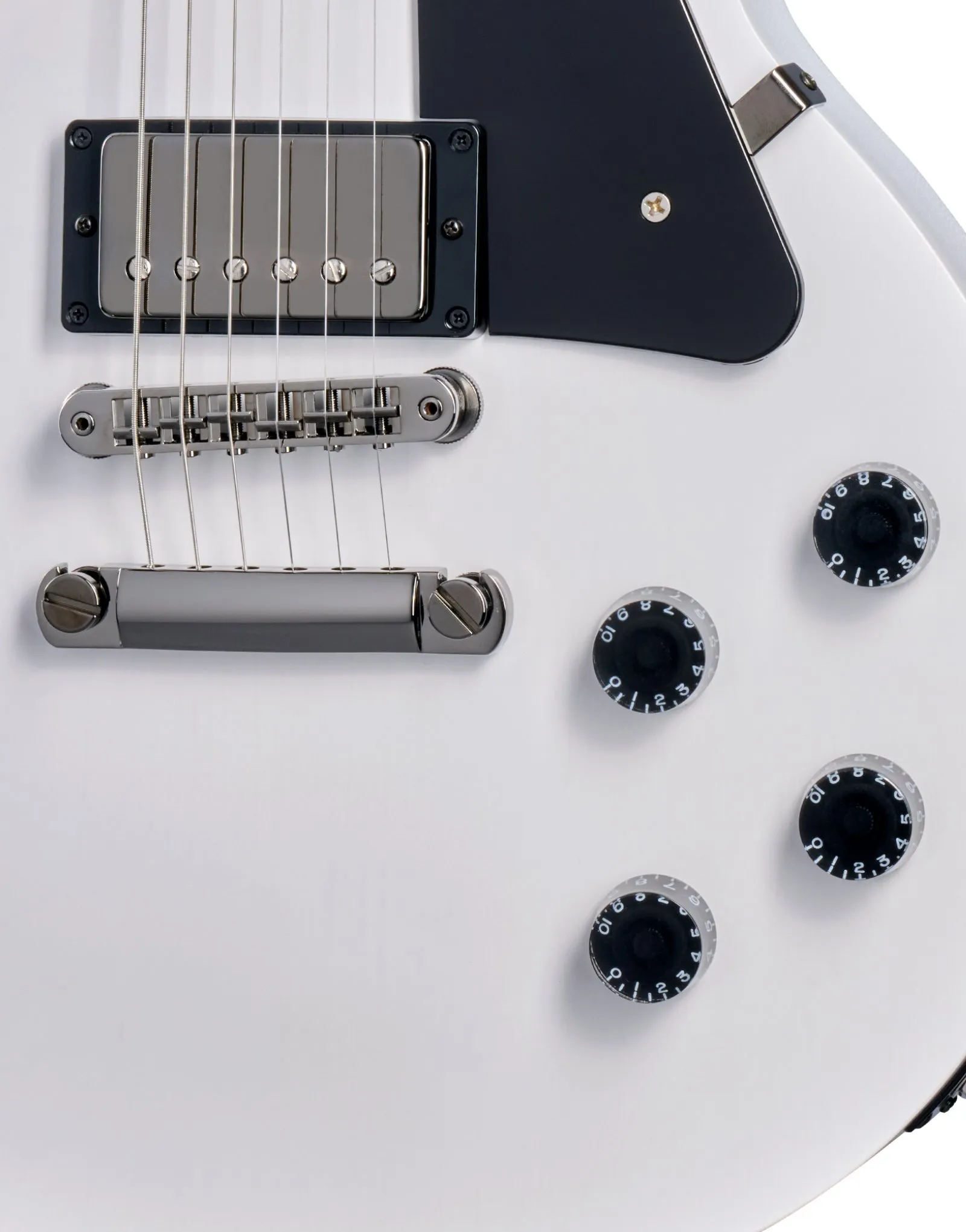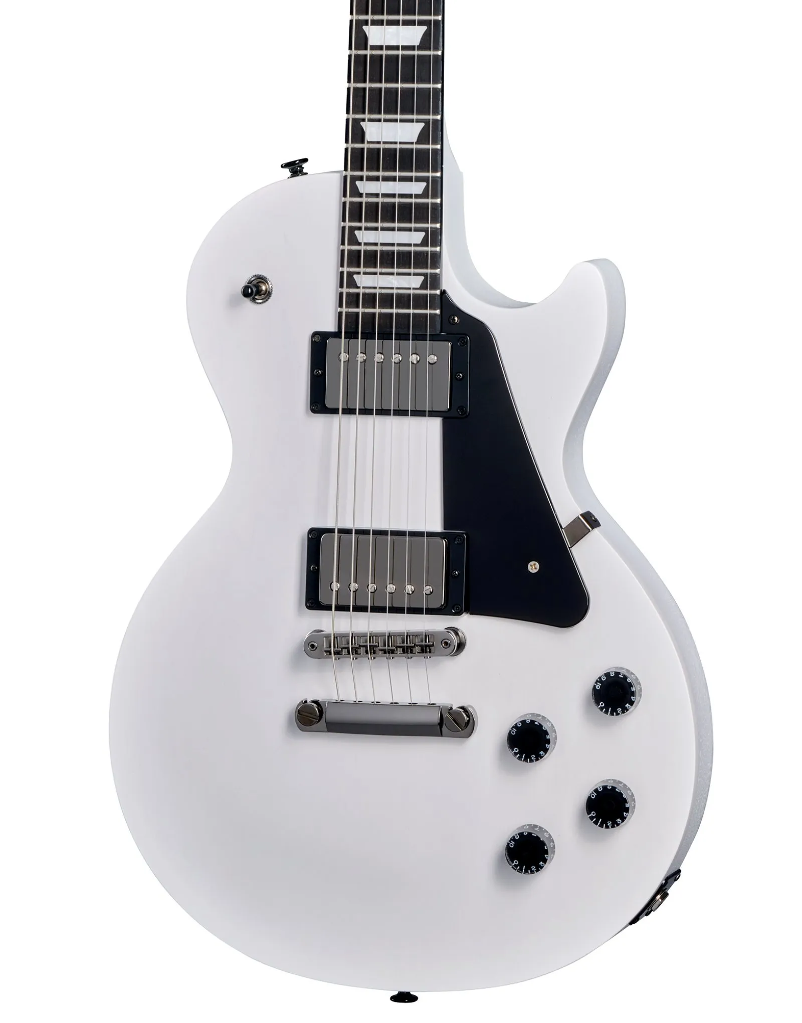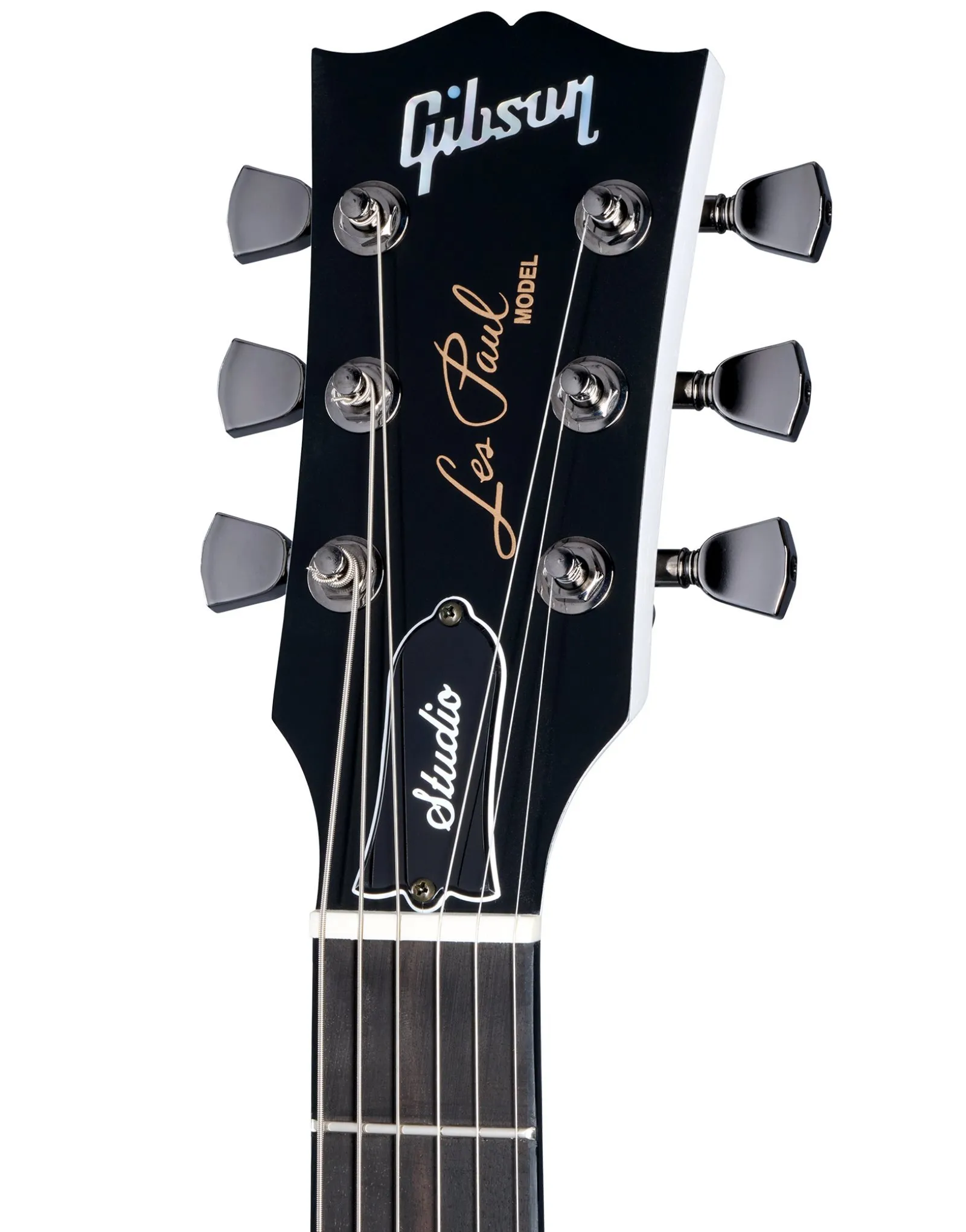 The Gibson Les Paul Modern Studio enhances the legendary Les Paul Studio with advanced features for modern players. It boasts an Ultra Modern weight-relieved mahogany body and maple cap, delivering classic tone with a lightweight feel. The bound ebony fretboard and compound radius provide effortless playability, while the Modern Contoured Heel ensures smooth upper-fret access. Equipped with coil-tapping, phase control, and pure bypass switching, this guitar offers extensive tonal versatility. Finished in sleek black nickel hardware, the Modern Studio is built for performance. Includes a soft shell case.