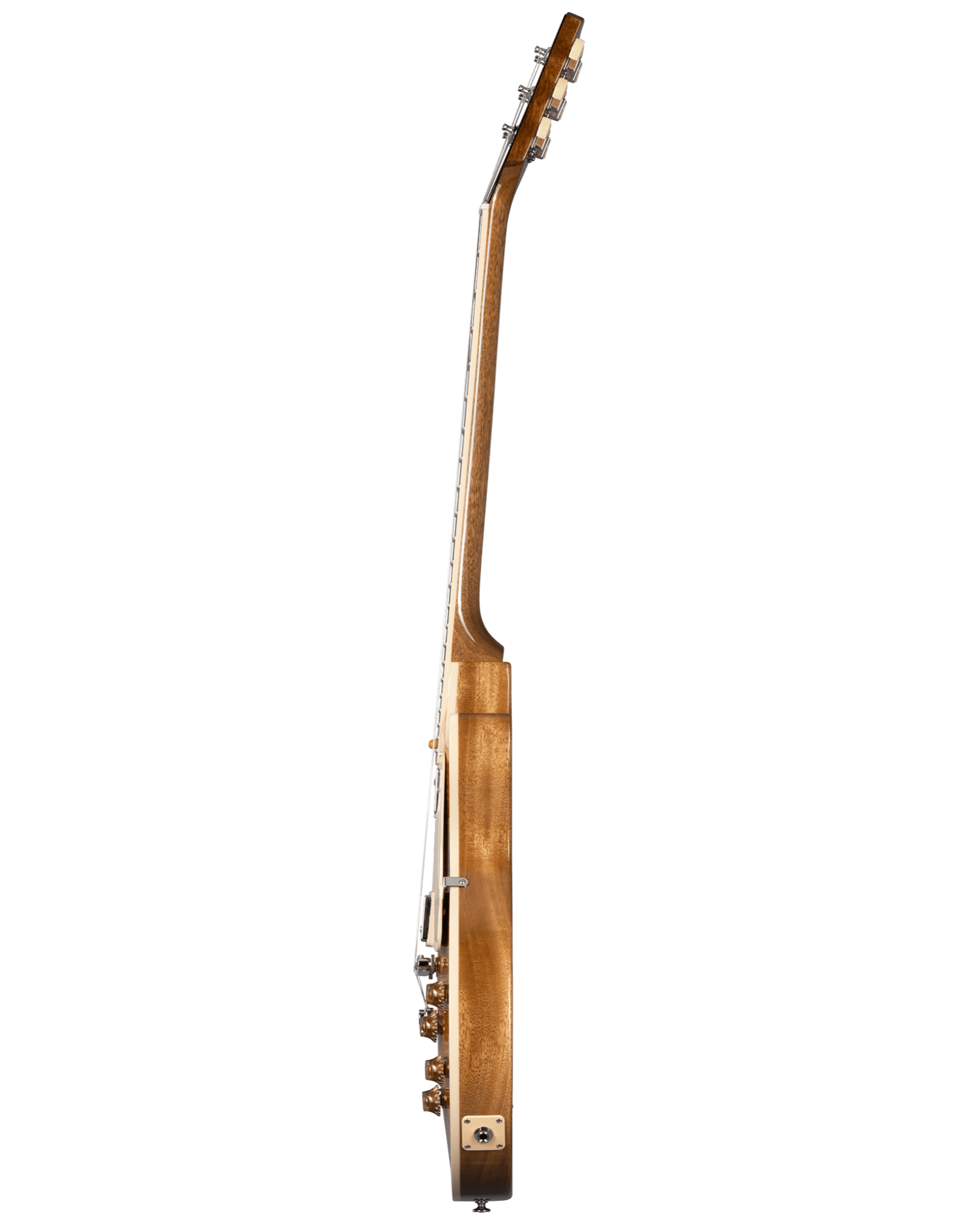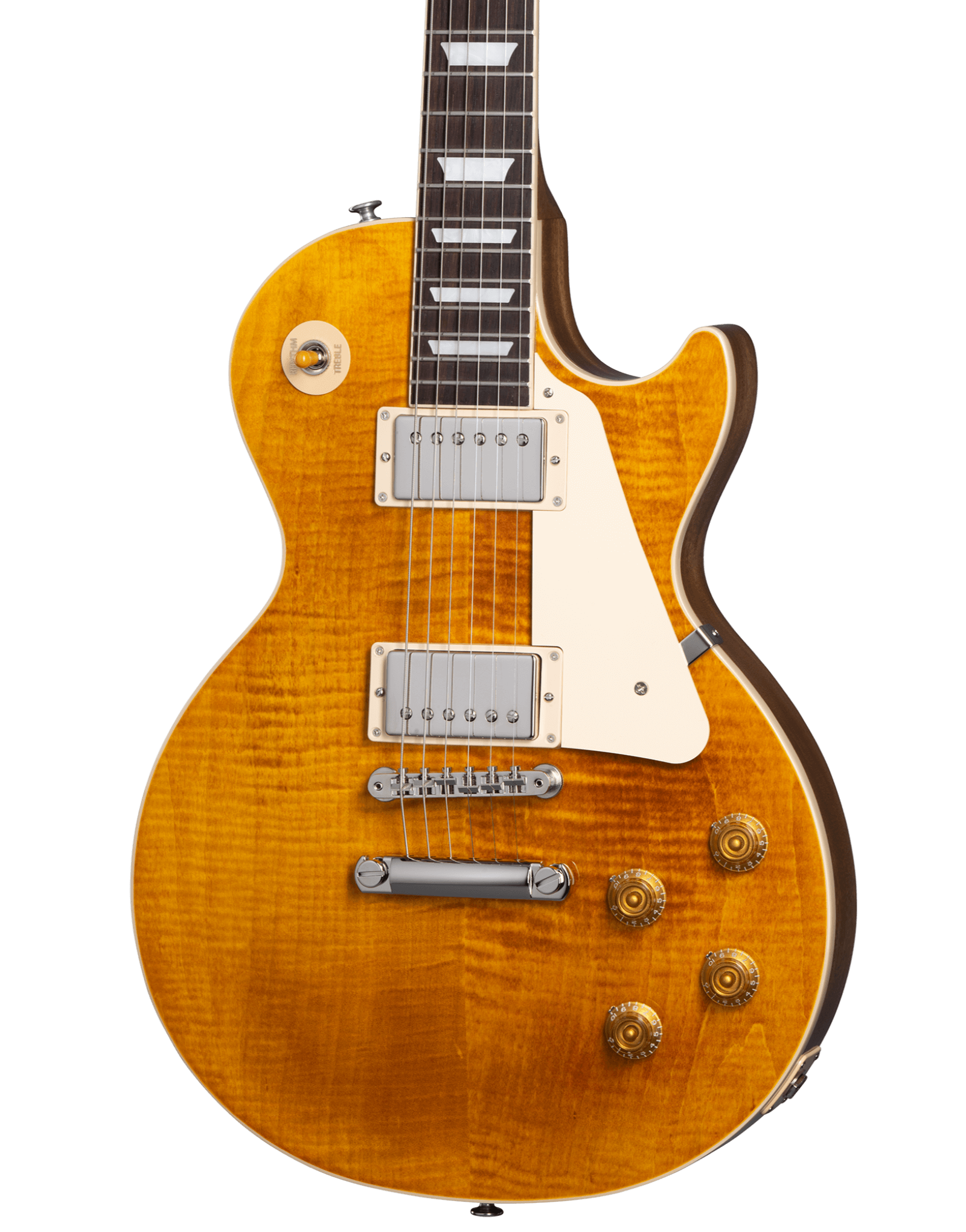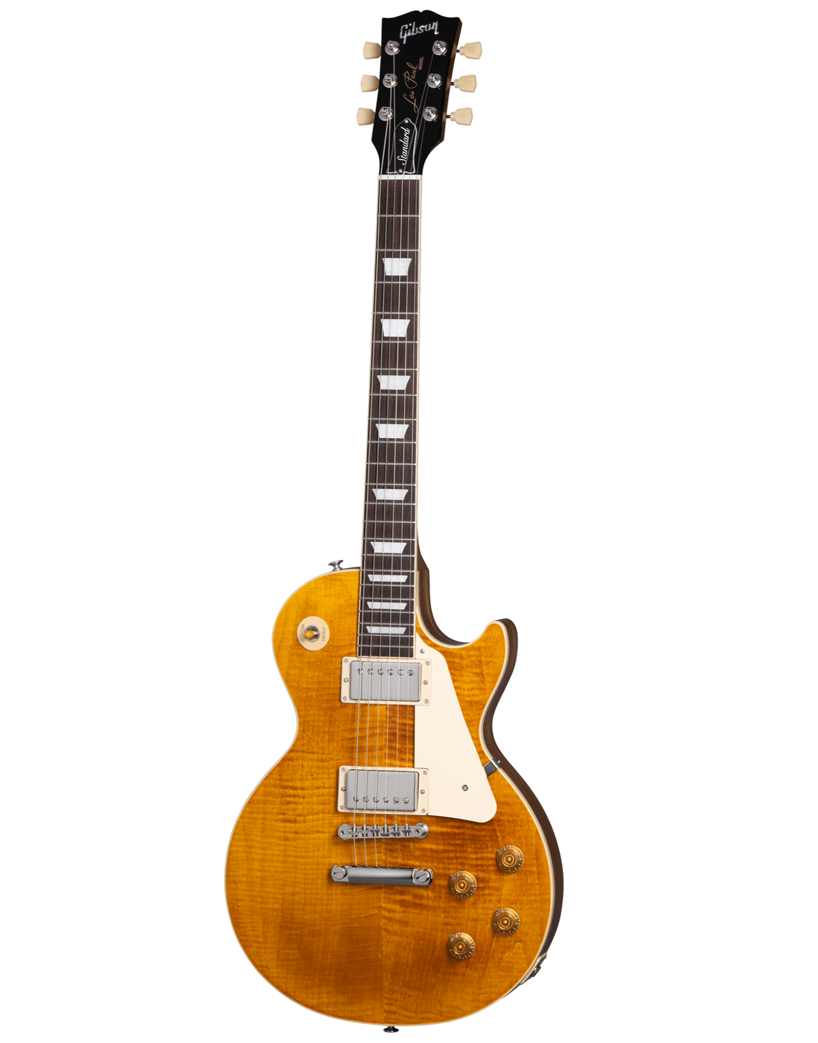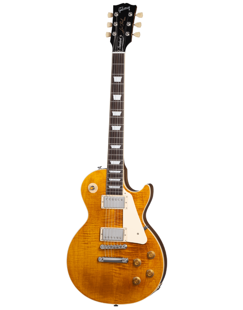 The new Les Paul Standard returns to the classic design that made it relevant, played and loved -- shaping sound across generations and genres of music. It pays tribute to Gibson's Golden Era of innovation and brings authenticity back to life. The Les Paul Standard 50's has a solid mahogany body with a maple top, a rounded 50's-style mahogany neck with a rosewood fingerboard and trapezoid inlays. It's equipped with an ABR-1, the classic-style Tune-O-Matic bridge, aluminum stop bar tailpiece, vintage deluxe tuners with keystone buttons, and aged gold tophat knobs. The calibrated Burstbucker 1 (neck) and Burstbucker 2 (bridge) pickups are loaded with AlNiCo II magnets, audio taper potentiometers and orange drop capacitors.